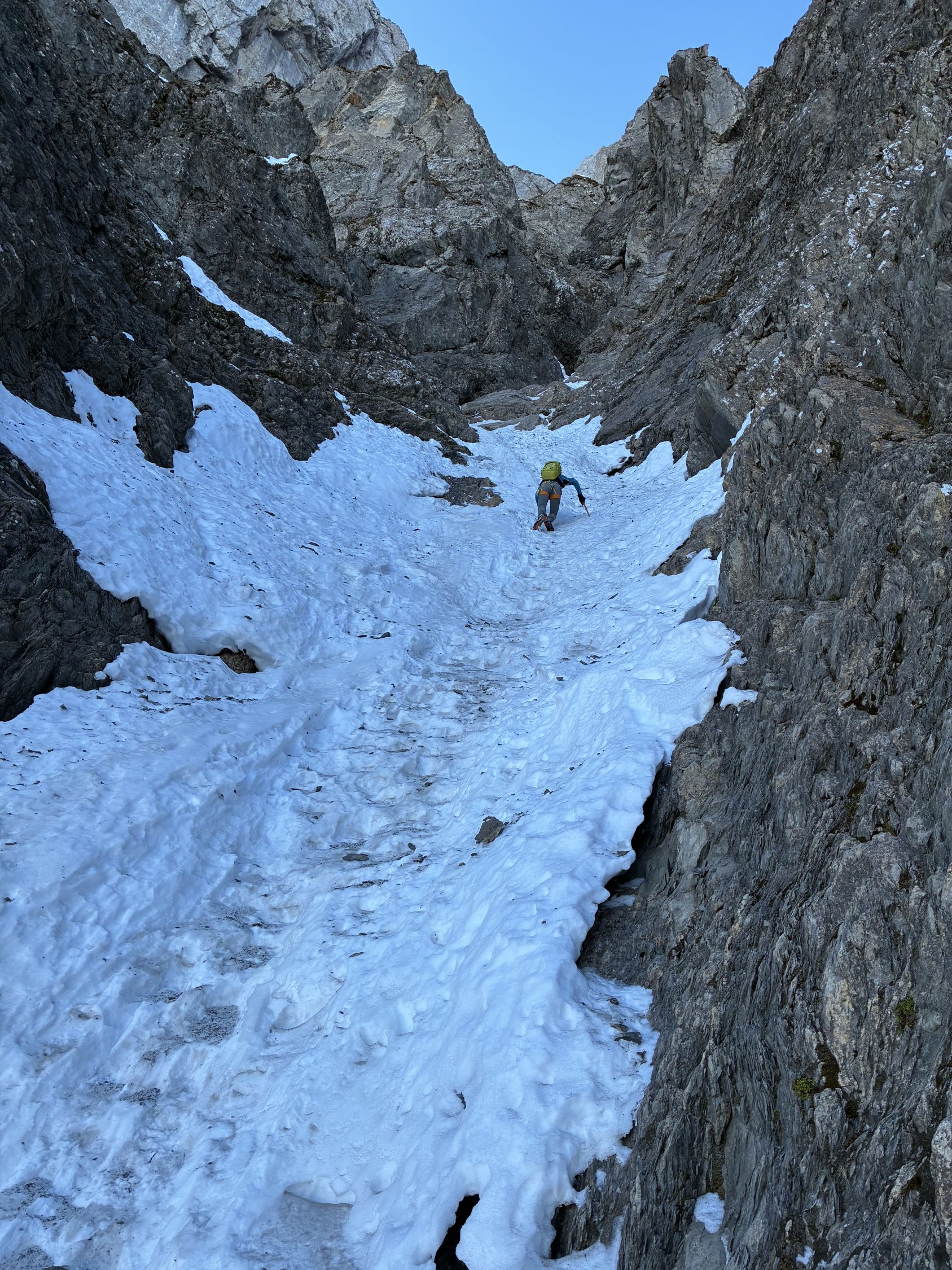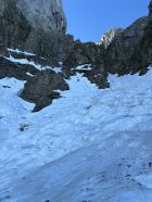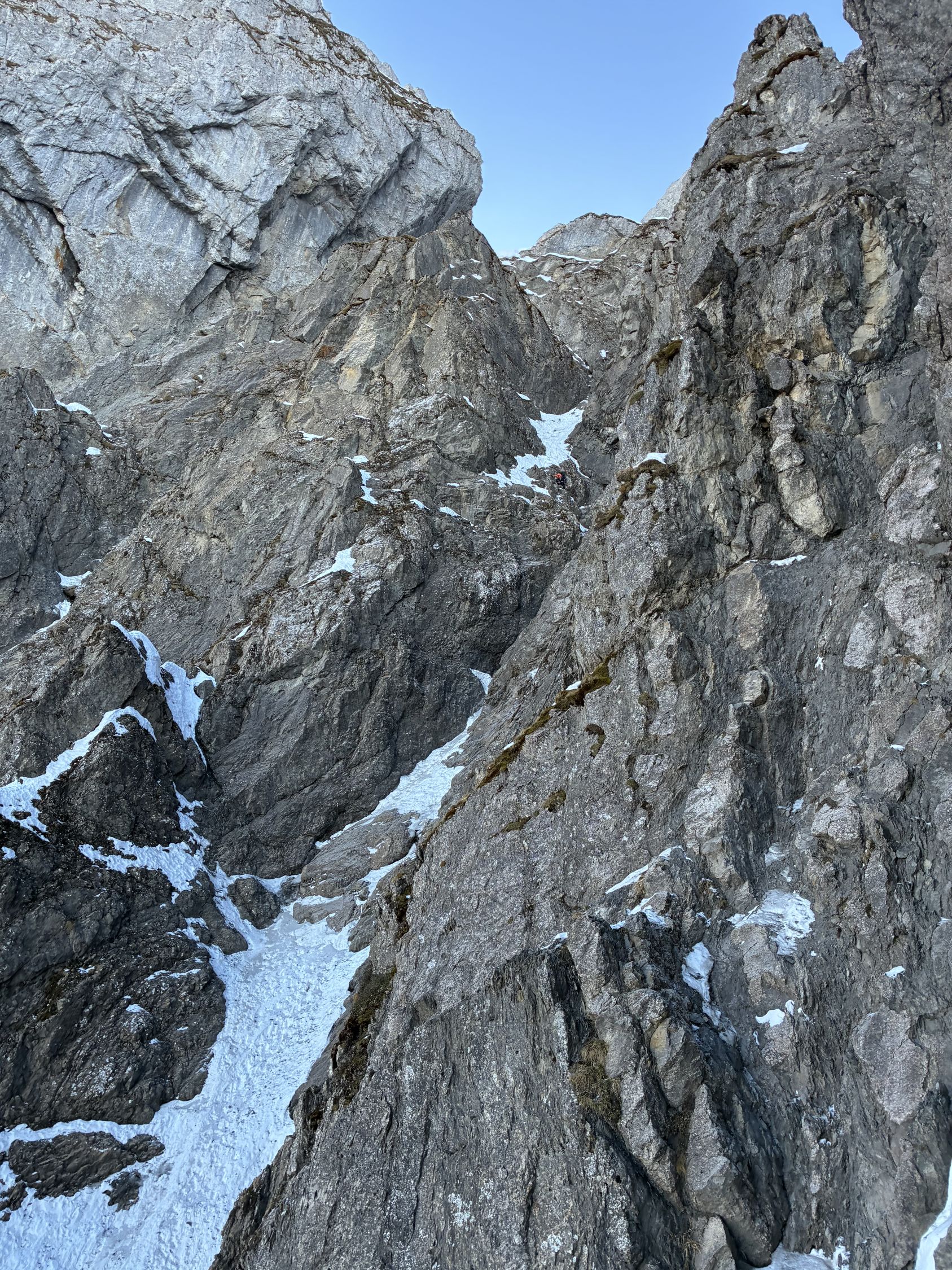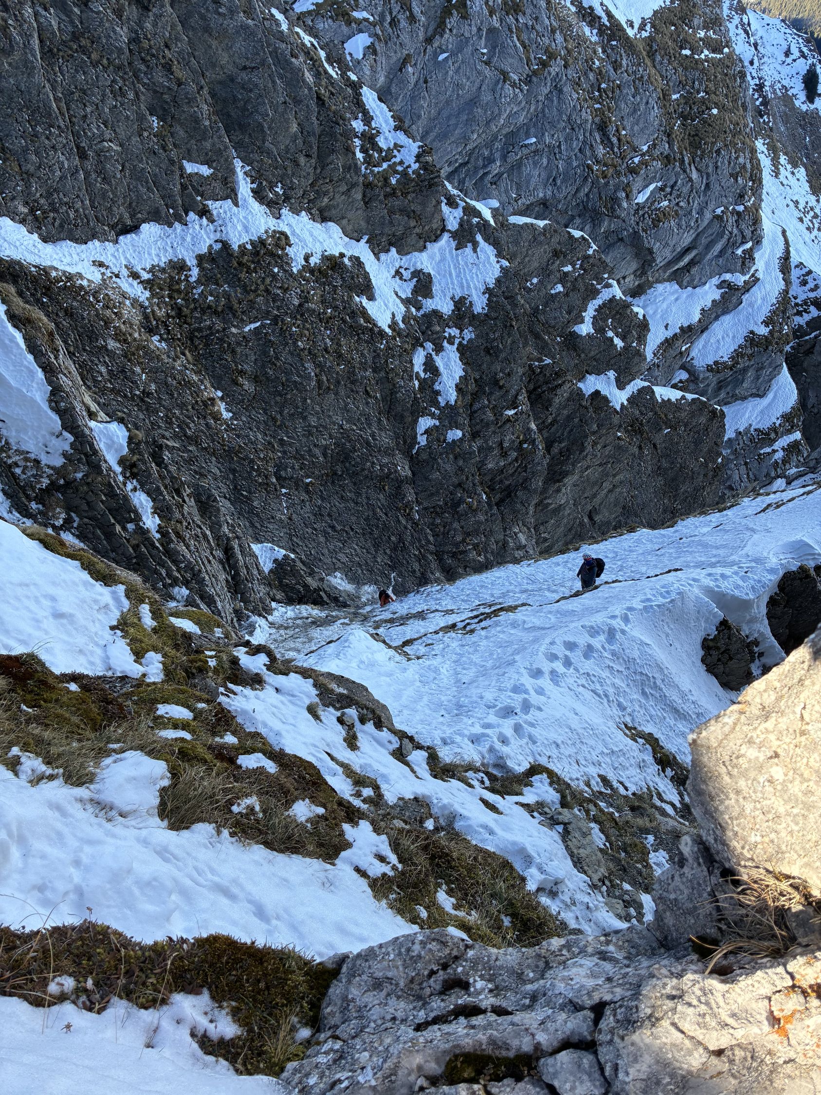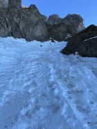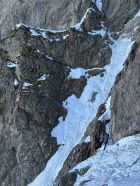 Das mittlere Couloir ist aktuell eher trocken mit recht viel Mixed-Anteil (siehe Bilder). Dies zumindest nach der Schilderung einer 2er Gruppe, die am Klemmblock zu uns aufschloss und das Unterfangen zu Ende brachte (wir trafen die beiden wieder oben am Ausstieg Sattel Eselwand, nachdem wir die Kulmchrachen Führe abgeschlossen hatten, den Esel umrundet und noch eine Erweiterung via Ostwand angehängt hatten). Chapeau für das mittlere Couloir.