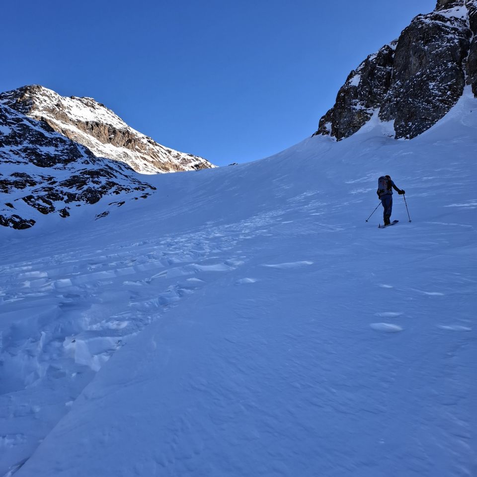 Kompakte Schneedecke aber wenig Schnee. Auf dem Klostertaler Gletscher sehr harte Verhältnisse, Harscheisen von grossen Vorteil. Am letzten Hang (Gipfelhang) wenig Schnee und nicht einfach zu gehen. Hier eventuell sogar Steigeisen erforderlich.