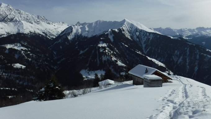 Schneeschuhe im Aufstieg erst beim Bergbauernhof Fallider angeschnallt. Abstieg auf beschriebener Route bis zum Parkplatz mit SS und Ski noch möglich.