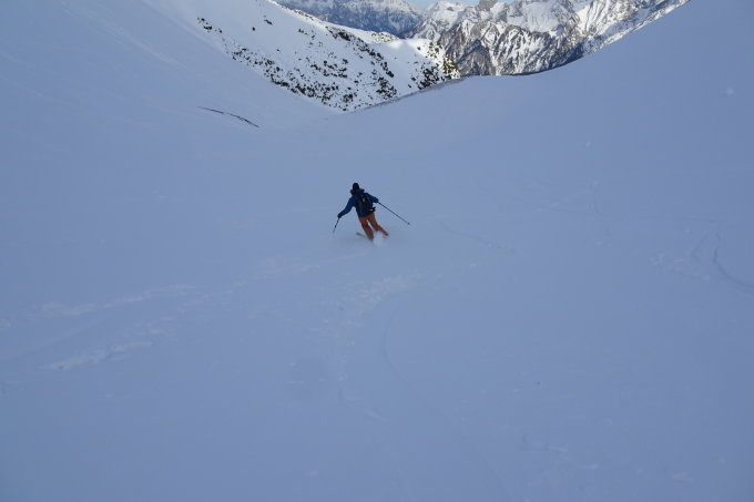 Abfahrt: noch lange nicht alles verfahren, wir sind hinüber gequert Richtung Blankuskopf und hatten sehr schönen Pulver. Keine Windverfrachtungen im Gelände.