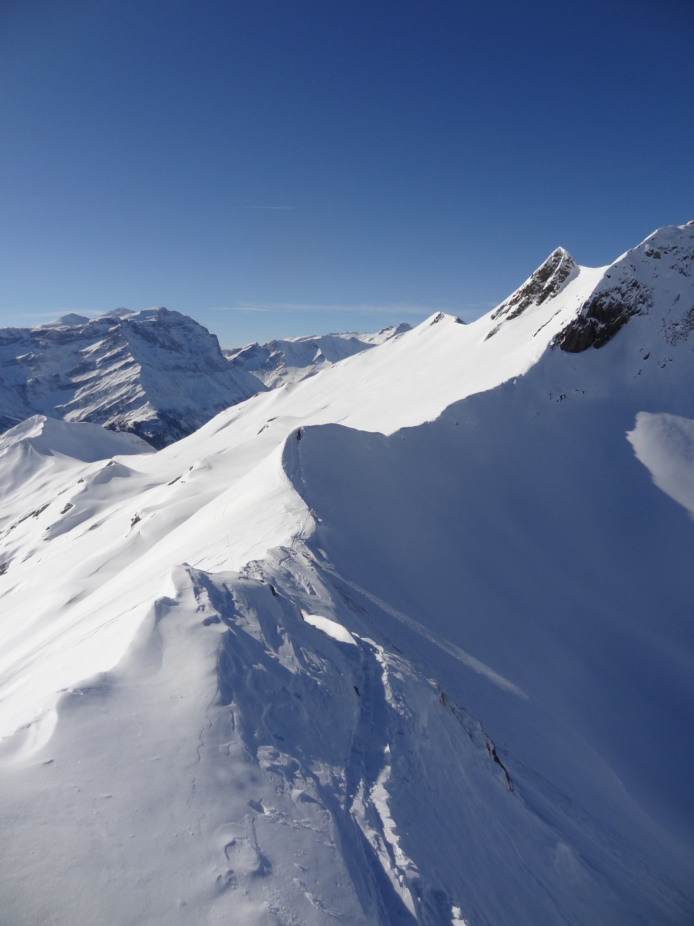 Ab Elm ist der Schnee unten raus an den sonnigen Hängen knapp, es geht aber gerade noch ohne die Skis zu tragen. Mit dem PW kann alternativ bis zum Raminer Stäfeli hochgefahren werden (am morgen allerdings ev. Eispiste). Ab da gut Schnee. Die Fahnenstockroute dann autobahnartig bis zur Alp Chamm. Danach wirds einsamer. Die steilen Hänge östlich des Grünspitzes sowie im Aufstieg zu Pt. 2412 zeigten sich heute stabil. Letzteres ist ein steiler Südhang, bei den aktuellen Temperaturen wird dieser bereits weich und im Laufe des Tages instabil! Früh aufstehen lohnt sich hier.