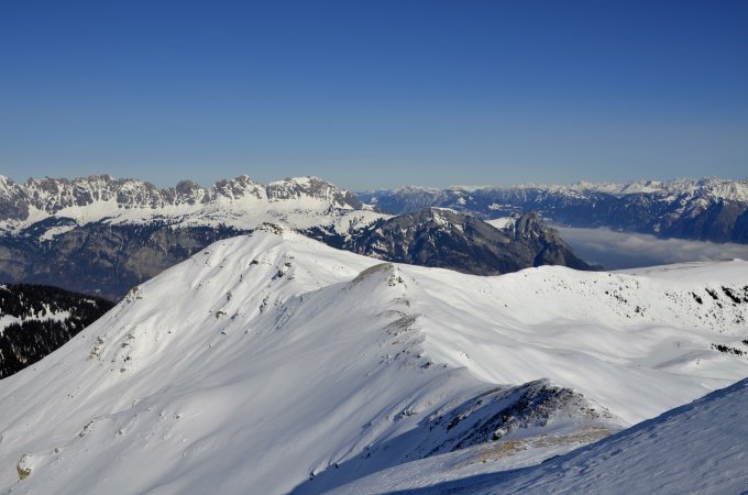 Es hat sehr wenig Schnee in der Gegend. Die Abfahrt nach Weisstannen geht nicht ohne Skitragen (2-3 Stellen von ein paar Metern Länge)