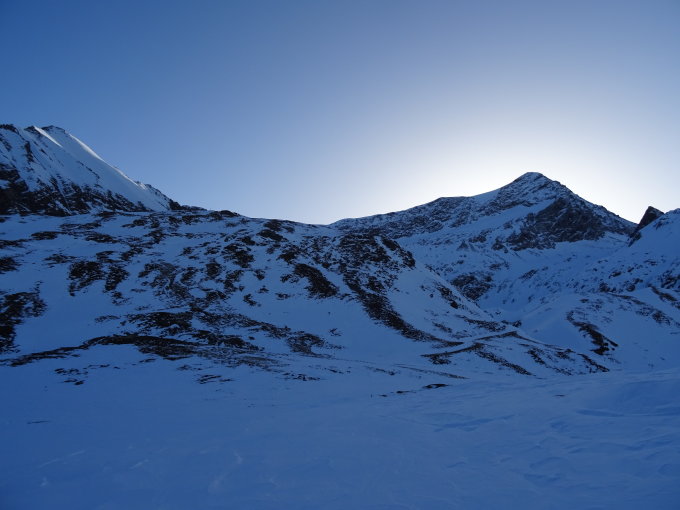 Aufstieg: sehr windgepresst, in der Steilstufe Harscheisen von Vorteil (Abfahrt hier über dem Normalweg sicher nicht optimal);