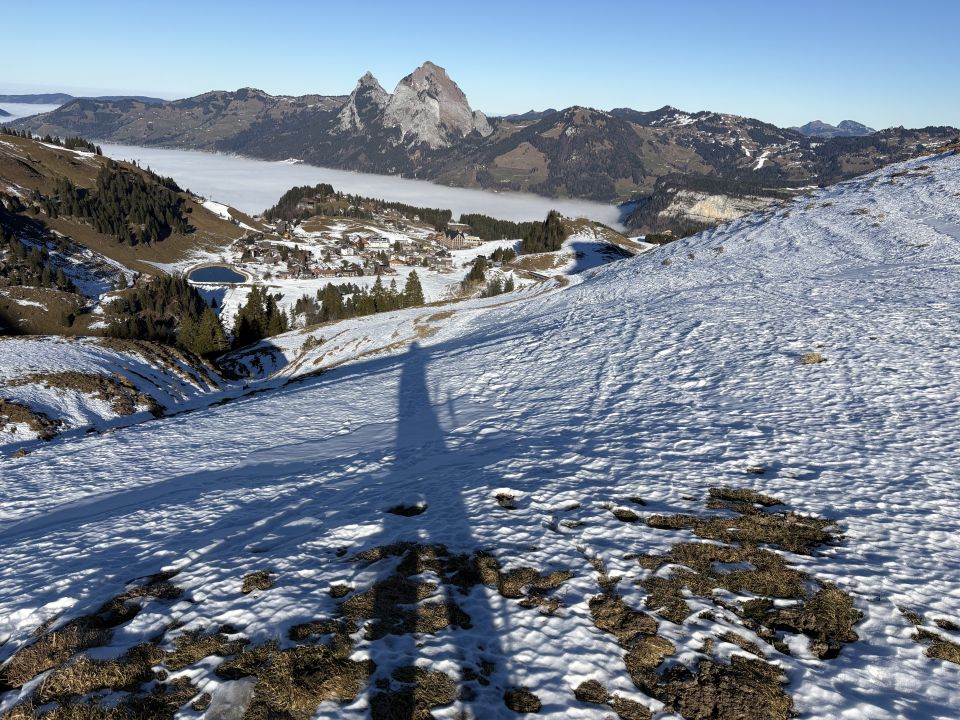 Aufstieg mit Schneeschuhen problemlos. Am Morgen hart gefrorene Unterlage. Schnee ab Beginn der Tour fast durchgehend. Am Schlusshang gibt es zahlreiche apere Stellen, die aber gut umgangen werden können.