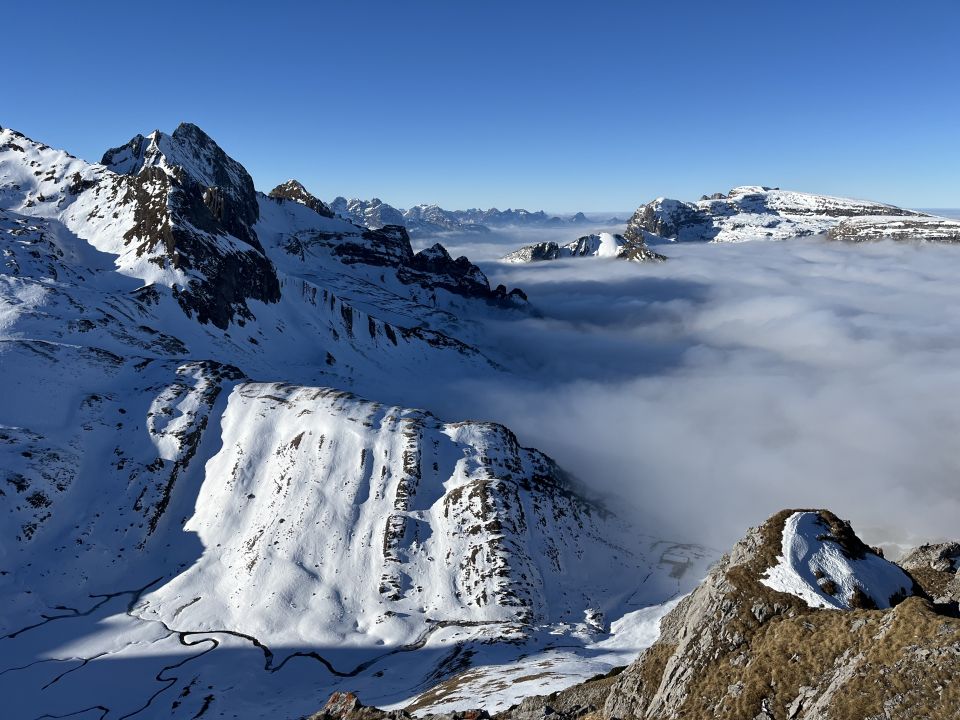Nebel bis etwas über 1800 m, darüber wolkenlos. Kühl aber wenig Wind. Wenig Schnee auf der ganzen Route und alles gespurt. Somit gut ohne Steigeisen und Gamaschen machbar. Angenehm: Das Wiesengelände auf dem Studnerberg blieb fast bis zuunterst gefroren.
