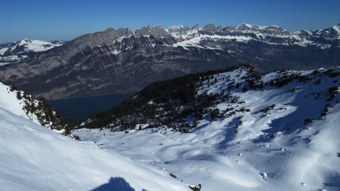 Firzstock-Flanke flächig eingefahren (siehe Bild), Fünfliber-Tour in letzter Zeit eher selten gemacht (eine dünne Spur (vermutlich) von Robmen herauf zum Bärenbodenkamm), keine groß sichtbaren Spuren Mürtschental; Nordseitig über Alp Bigiglen geht eine Spur und einige Abfahrtsspuren zum Gulmen-Kamm, Nordseite Alpbigligenstöckli über einen Rücken eingefahren, Schnee könnte evtl. bis zum Chatzenboden reichen.