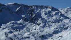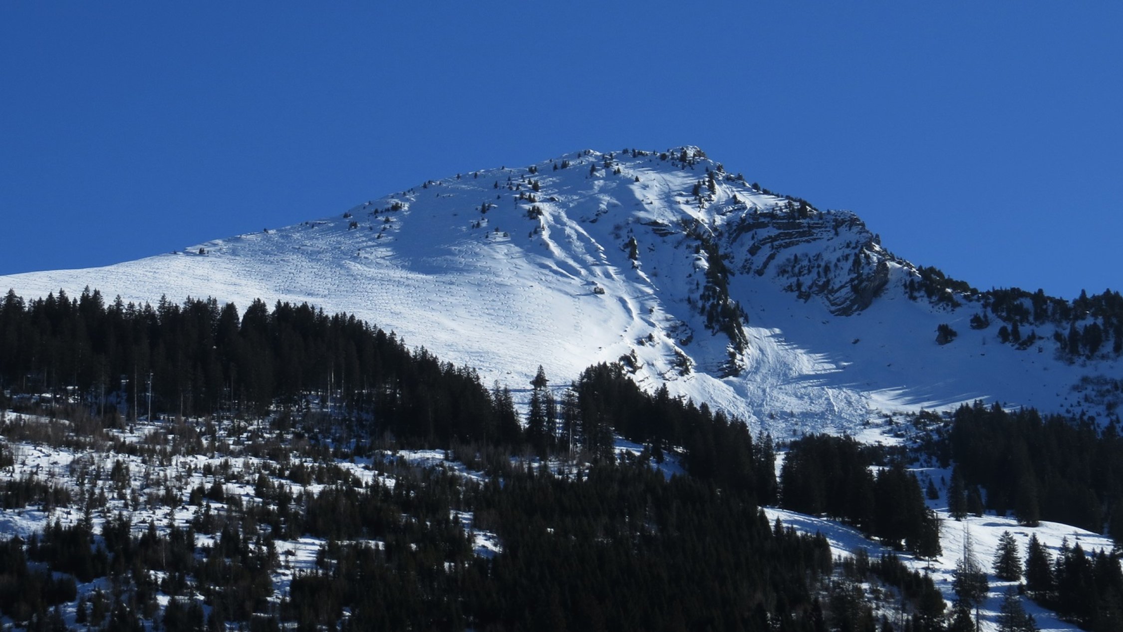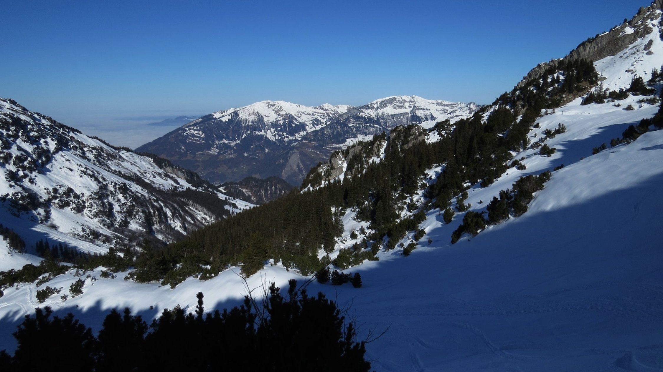 Morgens alles hart gefroren, mittags dann Sulz, bzw. in der Südflanke auch Firn. In der Nordwestflanke und tiefer in den bewaldeten Gebieten noch Pulver gefunden, Platz für eigene Spuren eher weniger. Abfahrt entlang der Alpwege momentan eine gute Alternative.