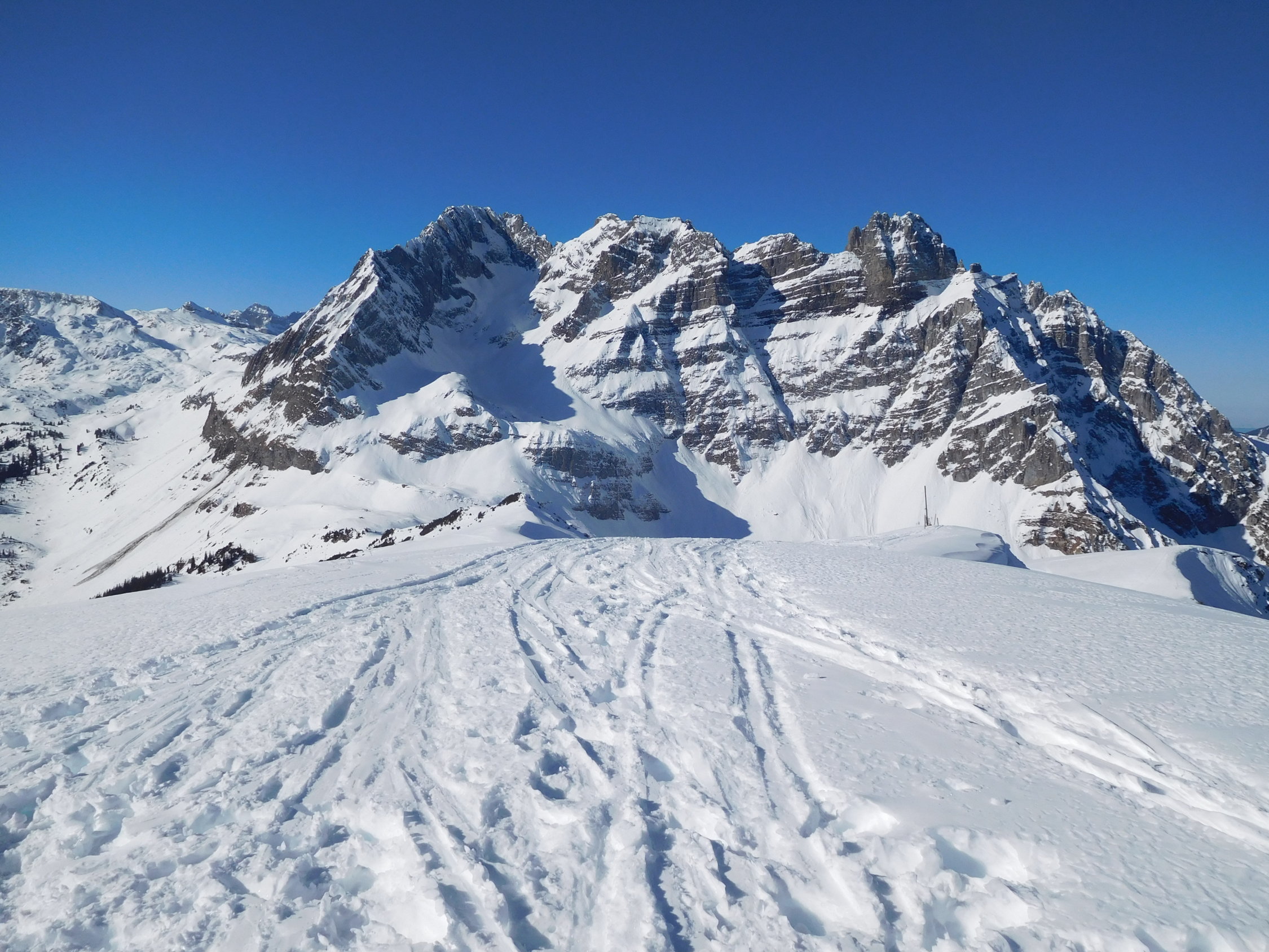 Auf guter Spur bis zur Alp Bigligen, ab hier durch die NW-Flanke zum Gipfel gespurt.