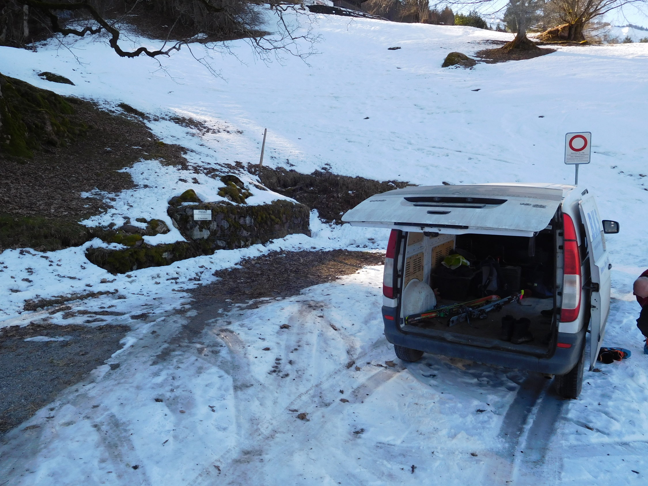 Start Katzenboden ( ca. 840 m )um ca. 8 Uhr, etwas beengte Parkmöglichkeit ( ein öffentlicher und zwei private Parkplätze). Hier ist die aktuelle Schneegrenze.