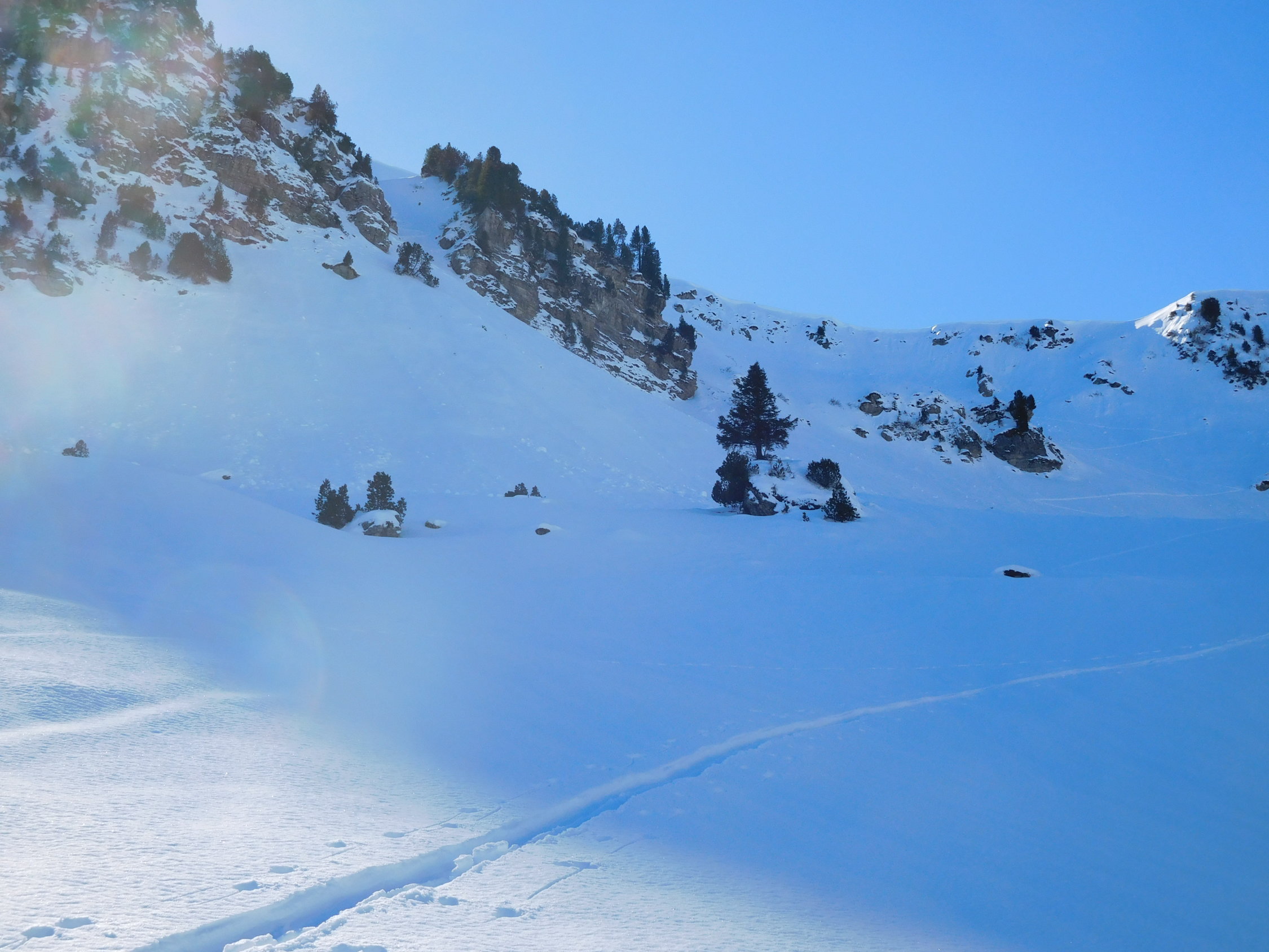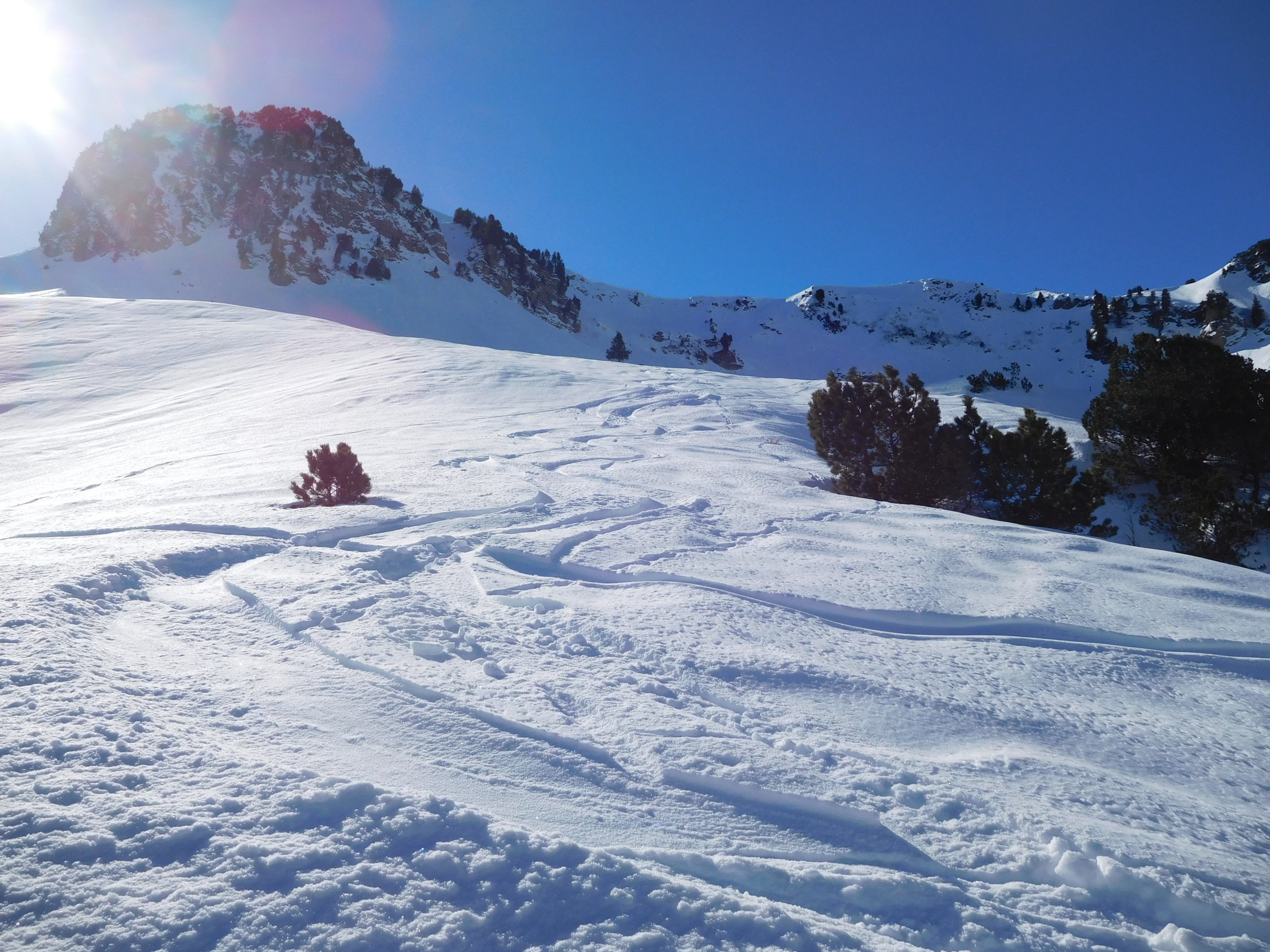 Nordseitig perfekter Pulverschnee in völlig unzerfahrenem Gelände.