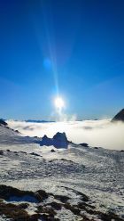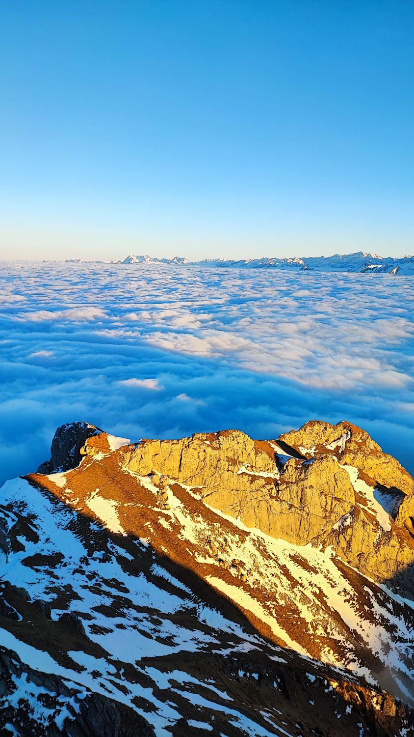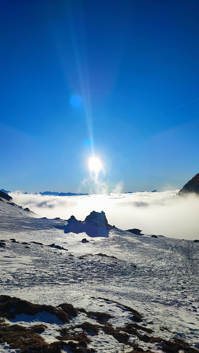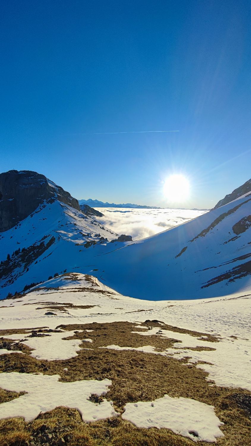 War ohne Schneeschuhe unterwegs, dank hartem Schnee gut zu gehen, kein Einsinken. Schnee beginnt kurz unterhalb Alp Fräkmünt.