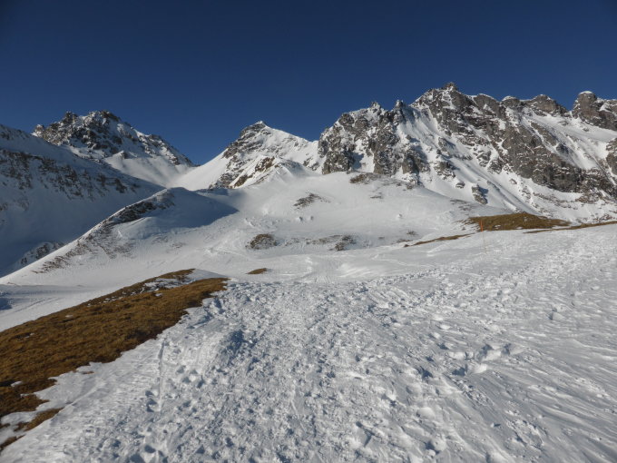 Schnee: gut! Im grossen und ganzen genug Schnee. Einzelne Kuppenpassagen benötigen Vorsicht wegen leider nur knapp überdeckten Steinen. Ansonsten sogar noch Pulver vorhanden, teilweise jedoch etwas leicht gedeckelt. Trotz vieler Abfahrtsspuren noch sehr gut zu fahren.