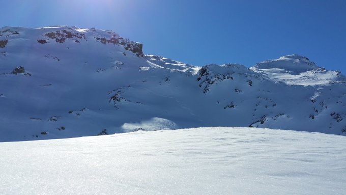 Schneebrett in Mulde unter Gipfel. Triebschneehänge sind ziemlich geladen.