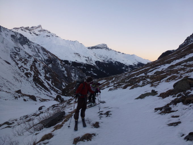 Ab Wichlen bis Ober Stafel sehr wenig Schnee. Das meiste geht mit den Ski an den Füssen, aber von Zeit zu Zeit sind auch kürzere Portagen nötig (vor allem in der steilen und absturzgefährdeten Traverse von Saumen). Nachher noch eine kurze Portage (kein Schnee) ums Eck bei ca. 2000 m ü. M., der Rest geht mit Skis an den Füssen.