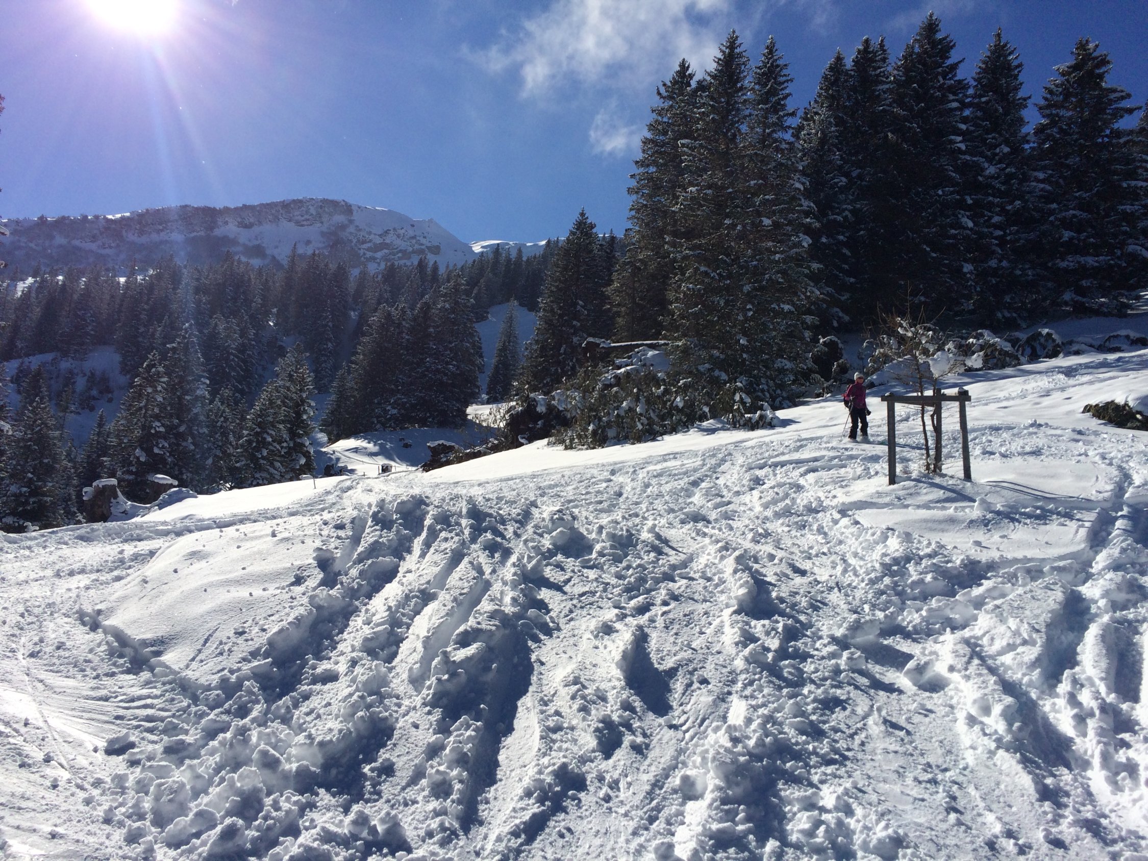 Pulver, etwas Windeinfluss auf der Rosswies. Morgens blies noch ein kalter Wind der Schnee umgelagert hat. Spur gut.