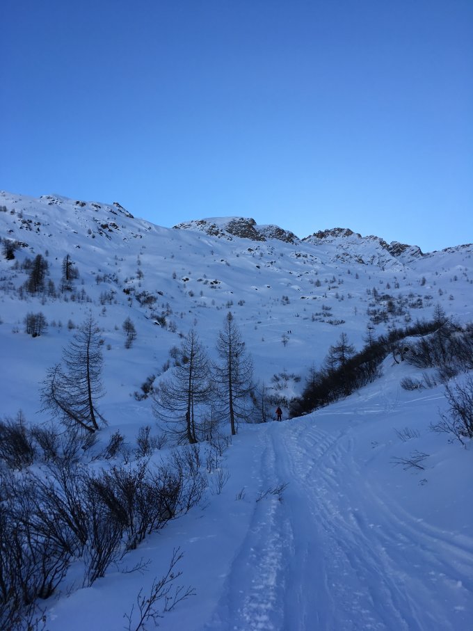 Abfahrt Val piana: Oben kompakter Pulver bis nach Brücke P.1833 Tiptop dann Wechsel zu Hartschnee spielt aber nicht so eine Rolle die Forststrasse ist gut eingefahren.