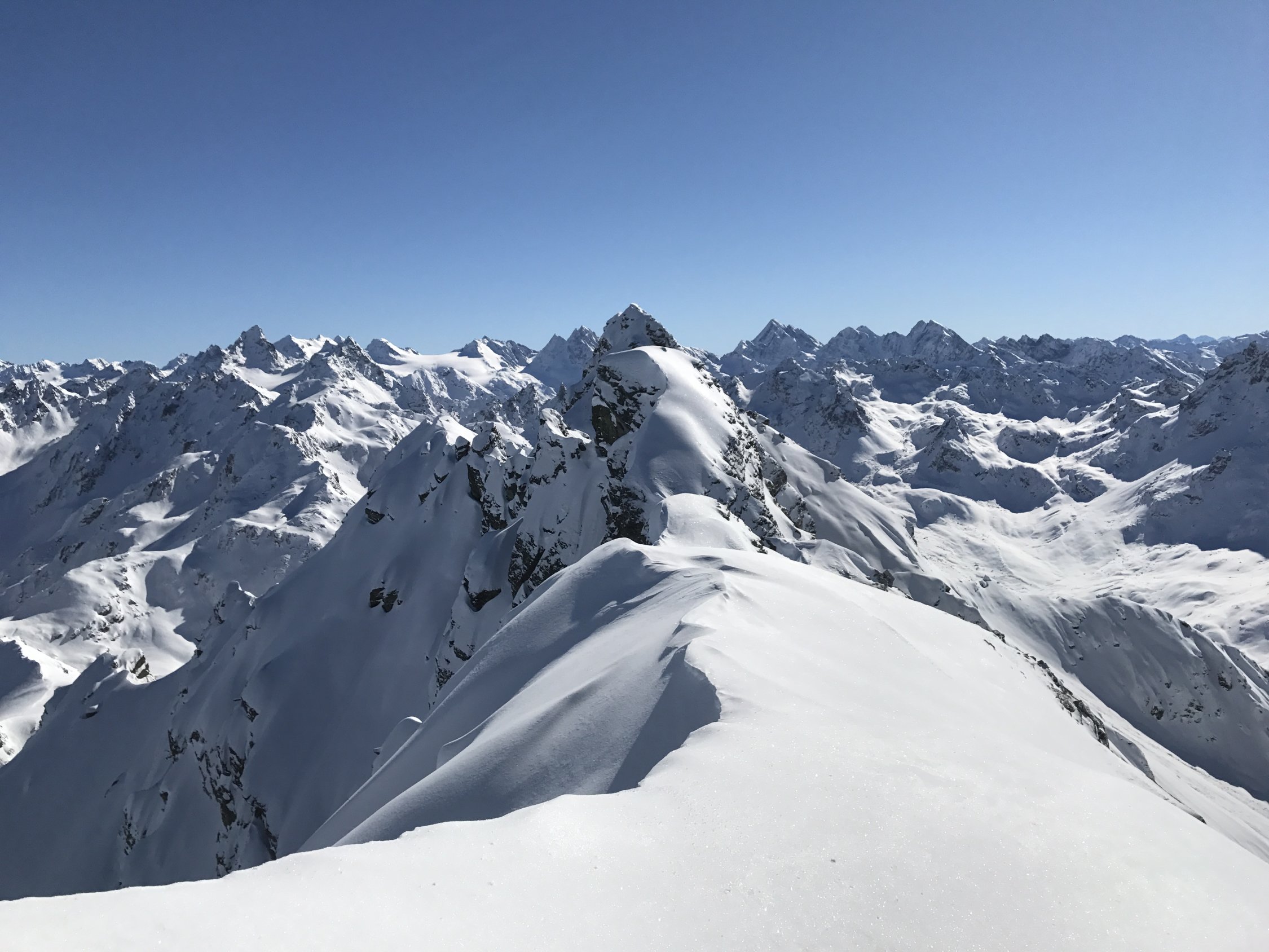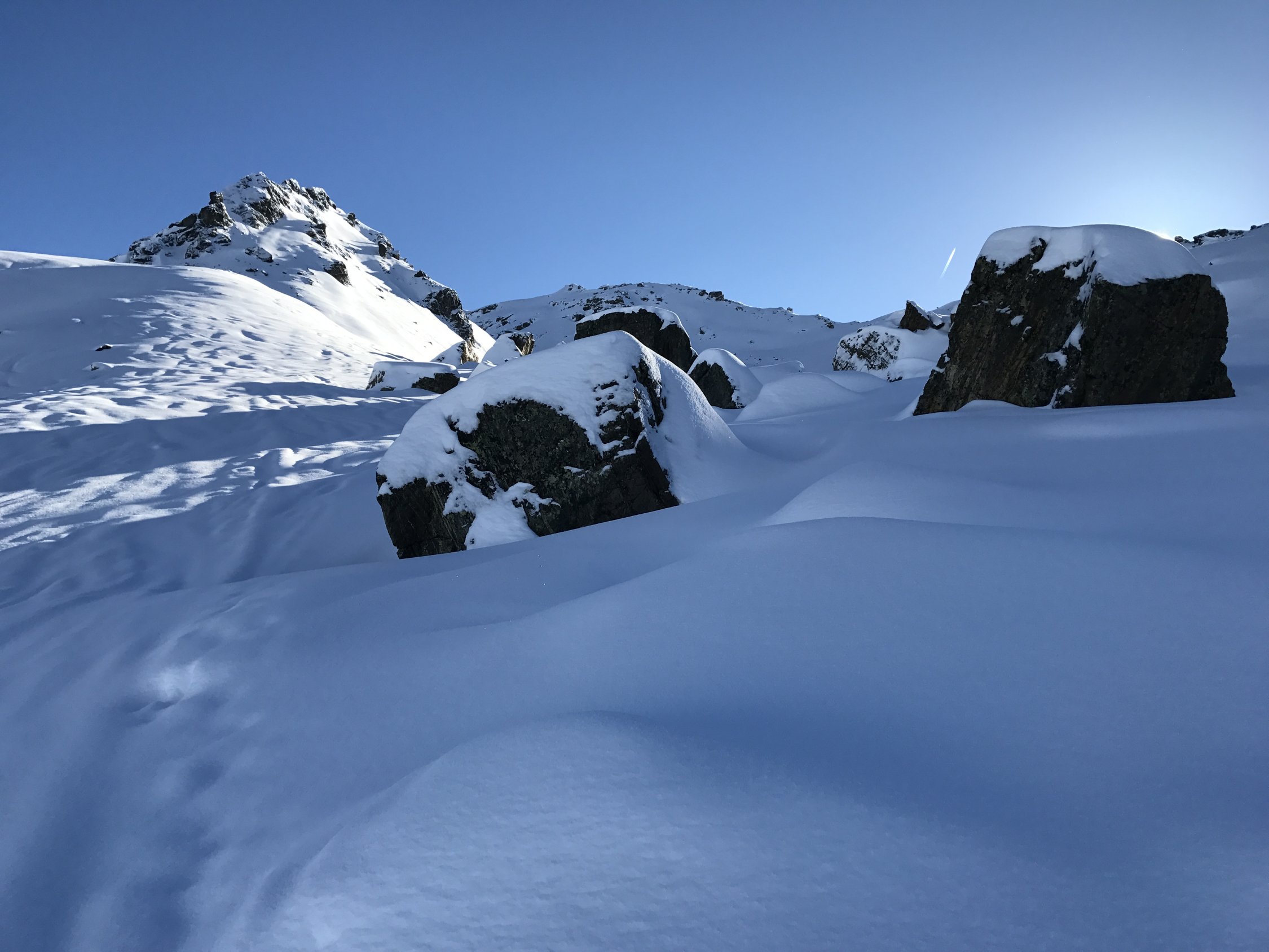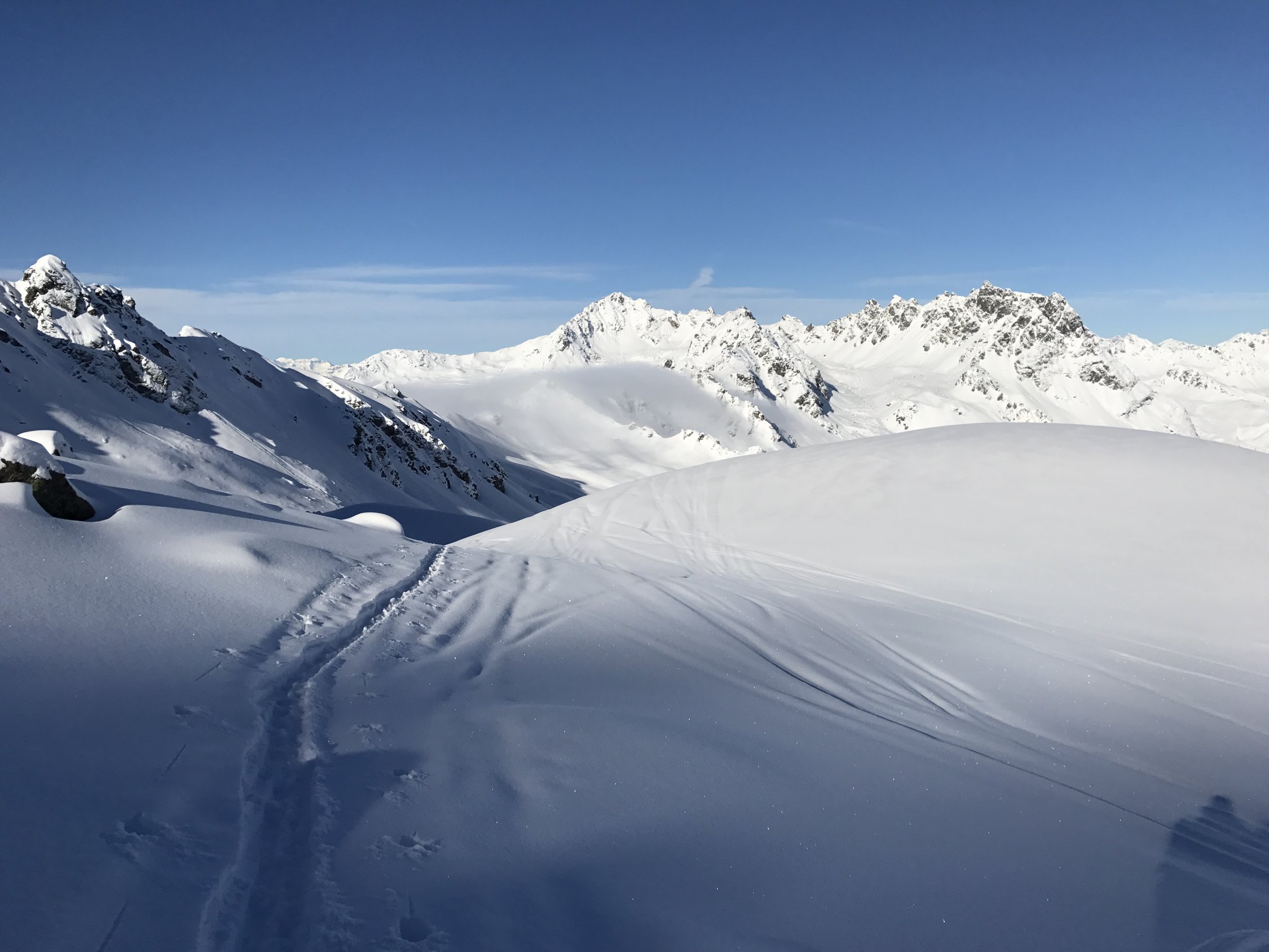 Schöner Pulverschnee (20 cm) vom Freitag! Trotzdem noch ein paar Steinkontakte beim Abfahren vom Gipfel ins Vergaldatal. Zurück nach Gargellen entlang der Aufstiegsspur zum Hinterberg - gute Alternative zum Rückweg entlang der Aufstiegspur im Wintertal/Zollhütte.