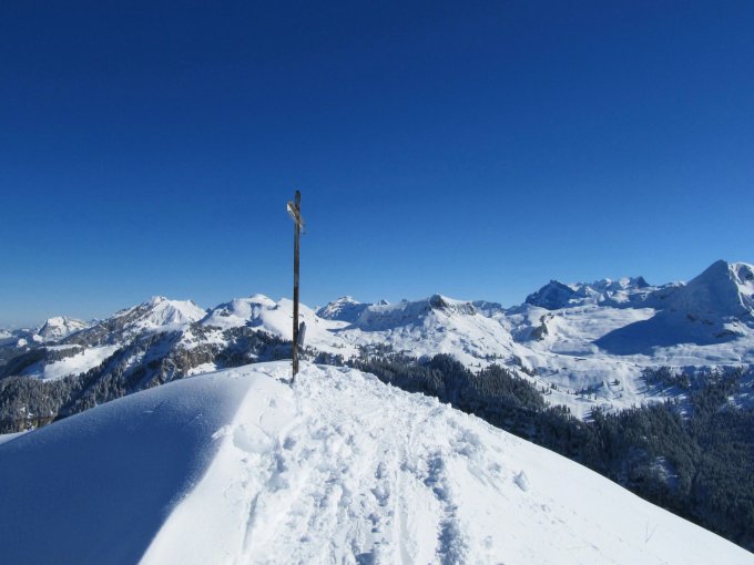 Die "Schlüsselstelle" befand sich am Zustieg zum Gipfelrücken. Mit Schneeschuhen war dies früher, als mit den Ski möglich. Auf dem im Wald zuvor wohl schon aperen Gipfelrücken lag nur wenig Schnee.