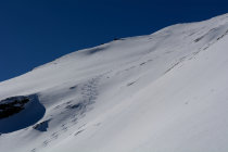 Diese Abfahrt stellt hohe Ansprüche an die Orientierung im (unübersichtlichen) Gelände. Keinesfalls die Traverse zur Tritthütte verpassen, sonst landet man irgendwo im felsdurchsetzten Niemandsland...