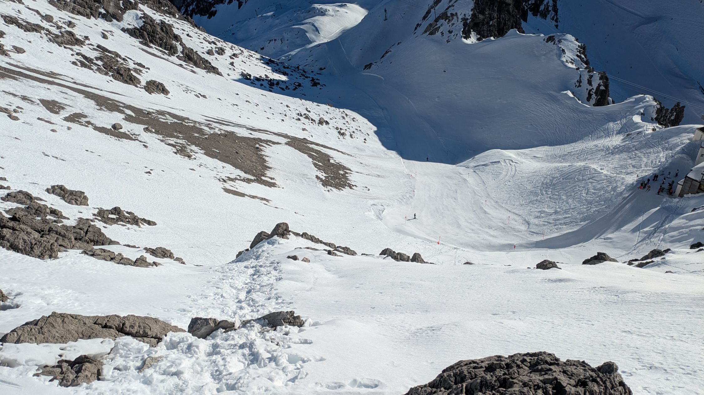 Piste gepflegt aber hart, Gute Trittspur zum Gipfel. Alleine hoch, runter Piste voll Skifahrer.