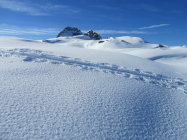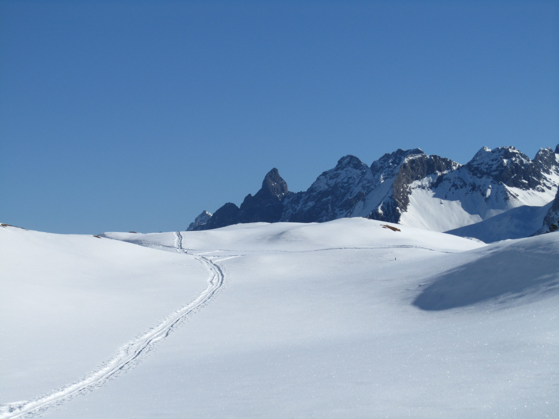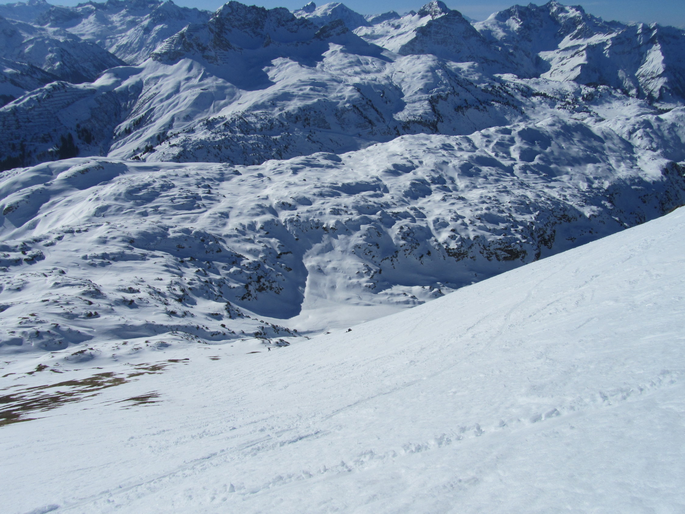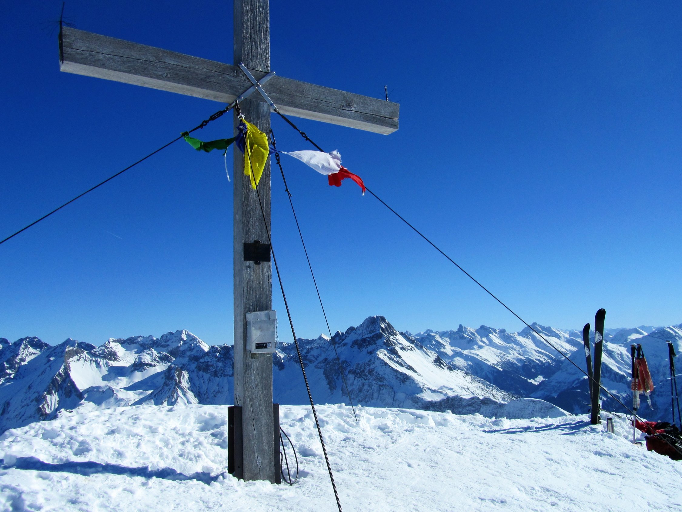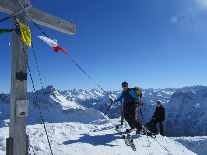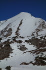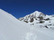 Beim südseitigen Aufstieg hat es schon morgens sehr früh aufgefirnt. Auf dem steilen Gipfelhang gut griffiger Schnee. Teilweise musste sogar schon über apere Stellen gelaufen werden. Am Gipfel fast windstill, gute Fernsicht bei wolkenlosem Himmel. Späte Abfahrt vom Gipfel um ca. 13 h, entsprechend aufgeweicht war der Schnee.