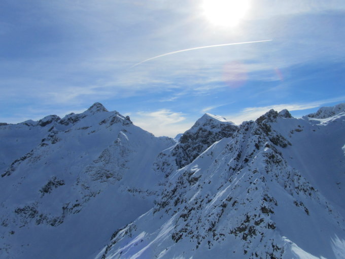 Blauer Himmel, in den Tälern Nebel, frisch verschneite Gipfel
