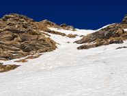 Ich bin mit Ski bis zum Gipfel durch ein knapp mit Schnee gefülltem steilen Couli aufgestiegen un abgefahren.
