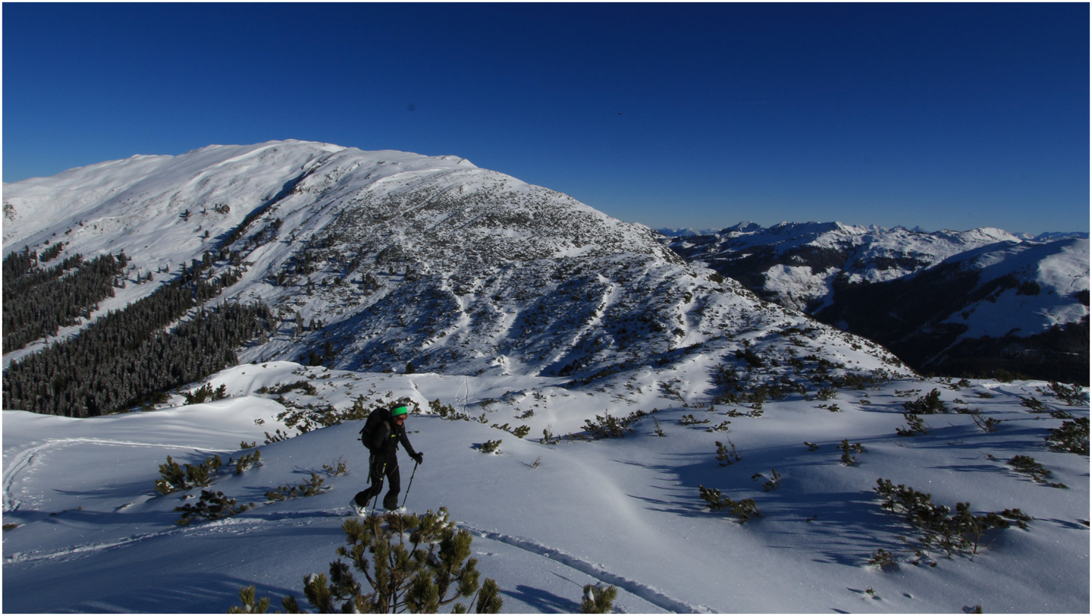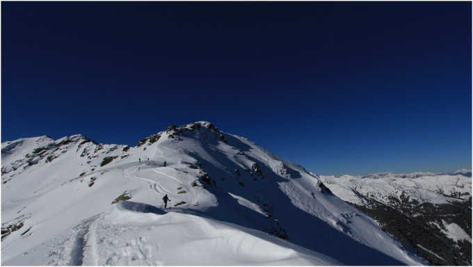 Auch am Grat teilweise ein wenig abgeweht und stellenweise zuwenig Schnee. Felsberührung lässt sich jedoch ganz gut vermeiden.