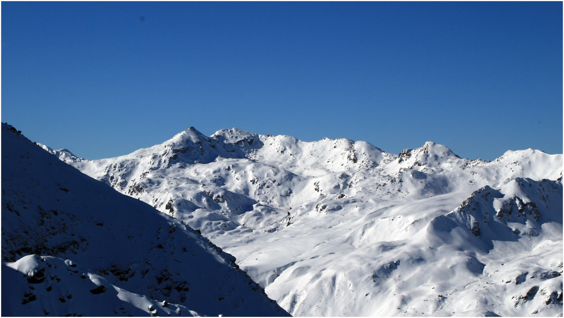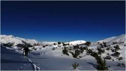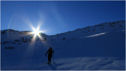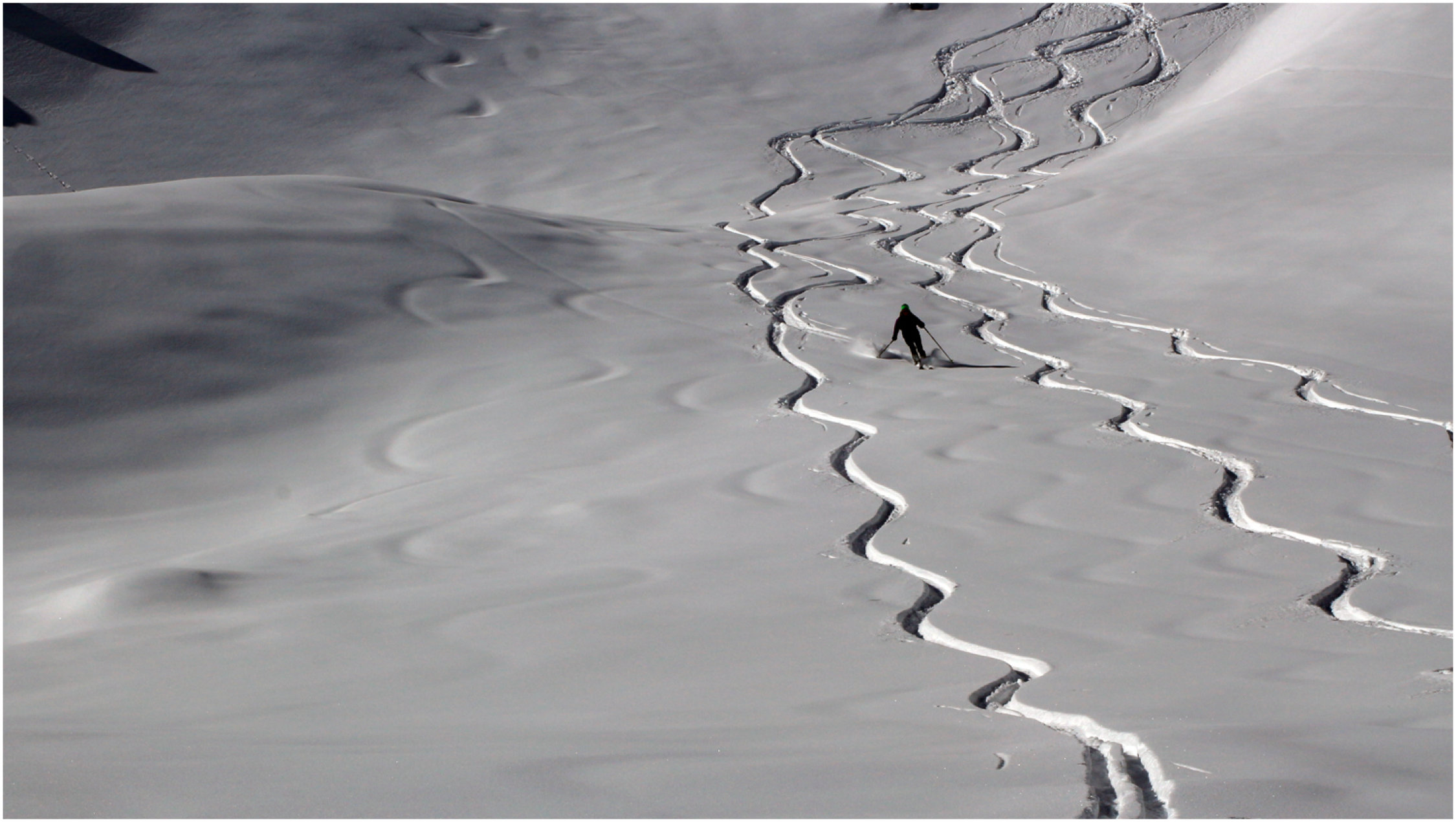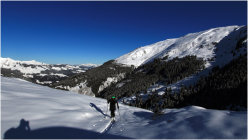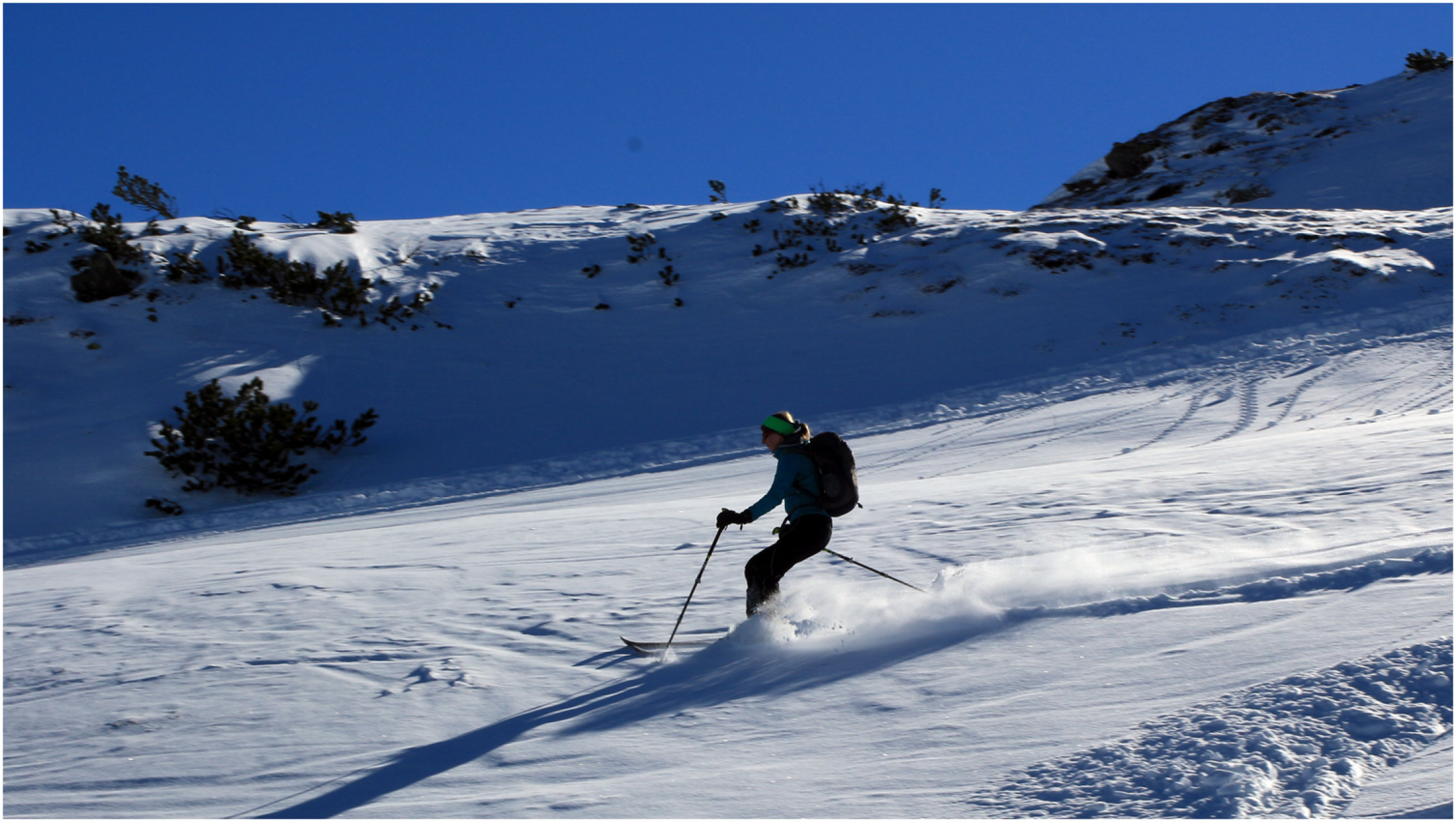 Insgesamt recht gute Bedingungen, auch wenn der Neuschnee nicht so üppig ausgefallen ist. Der gründlich umgegrabene Untergrund ist bisweilen spürbar, auch findet sich in nur teilweise besonnten Hängen ein leichter Deckel. Es liessen sich jedoch jede Menge guter Pulverhänge finden. Gipfelnordhang wurde auch befahren, derzeit jedoch nicht empfehlenswert weil schlechter Untergrund und zuwenig Neuschnee.
