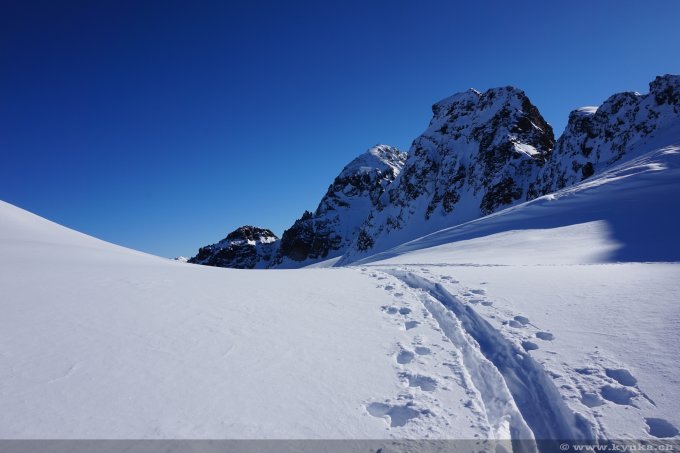 Es hat in den Mulden genügend Schnee, Gletscher ist gut eingeschneit. Auf den Rücken ist der Schnee weggbelasen.