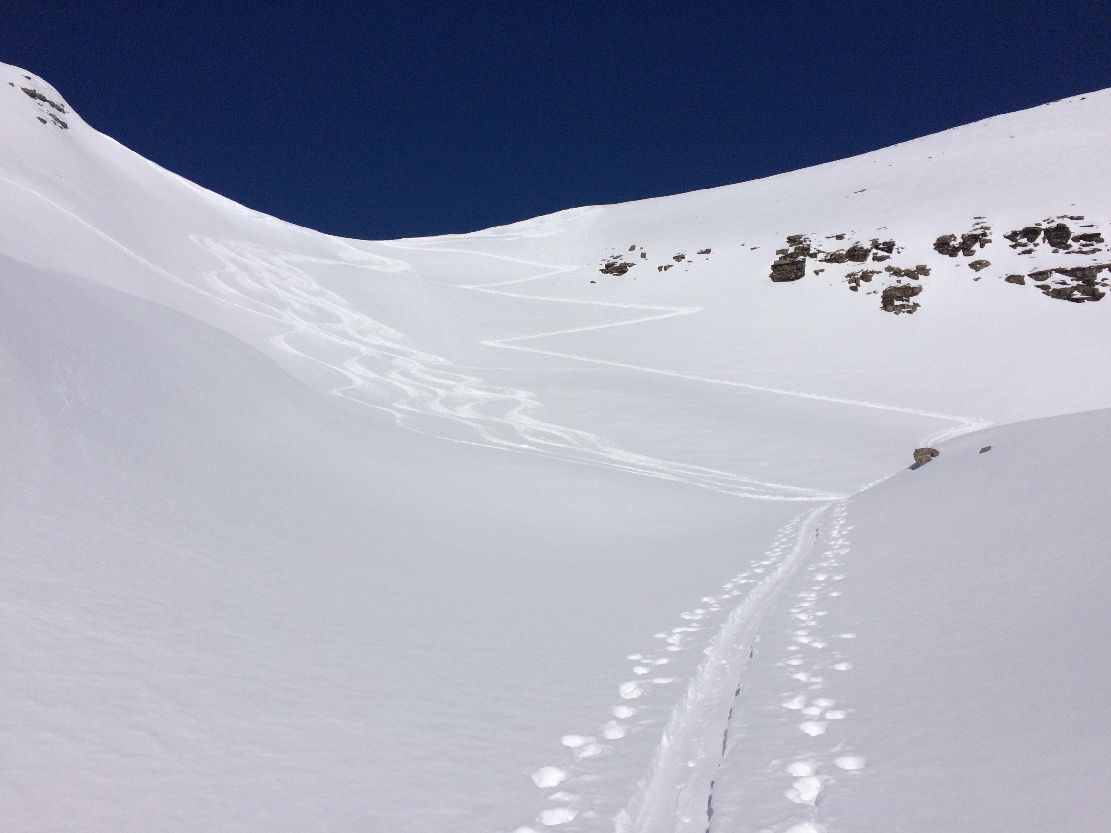Ab Faulhorn wieder zurück in Richtung Bachsee südl. Pkt. 2619 über schönen Hang zum Bachläger und Wildspitz und über Bort zurück nach Grindelwald. Letztes Stück über gesperrte Talabfahrt mühsam und nicht viel Schnee.