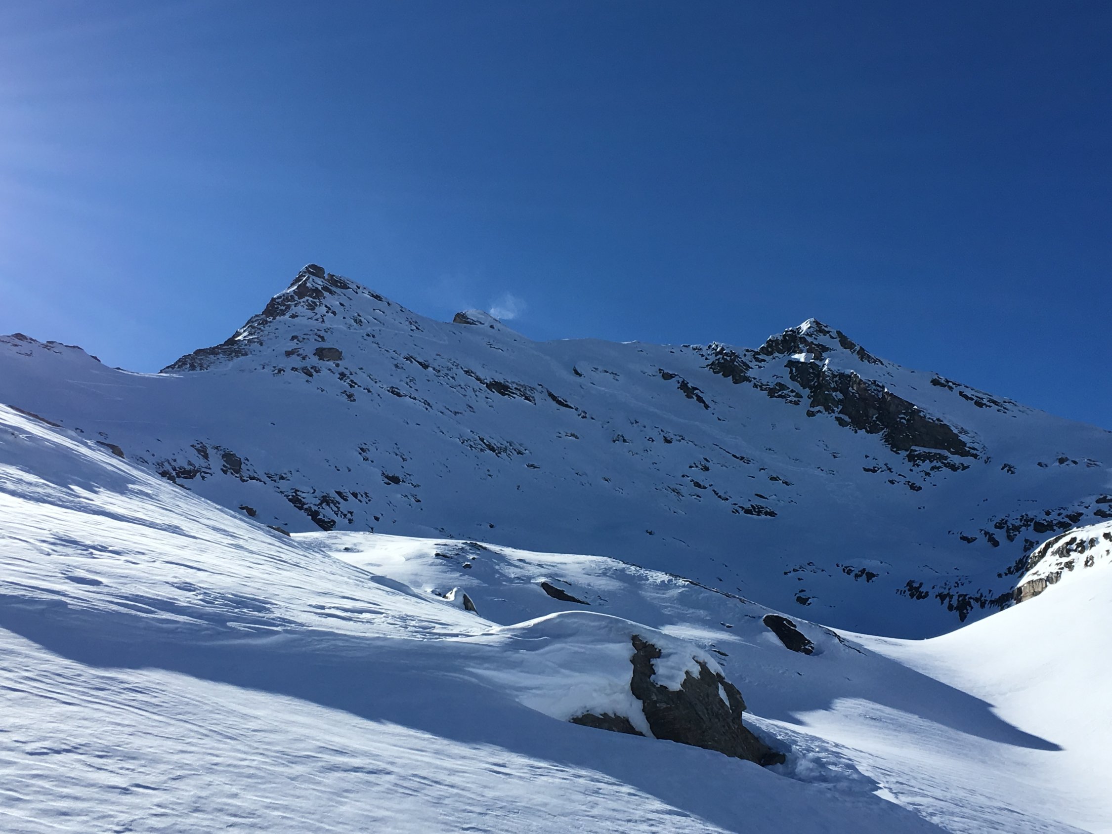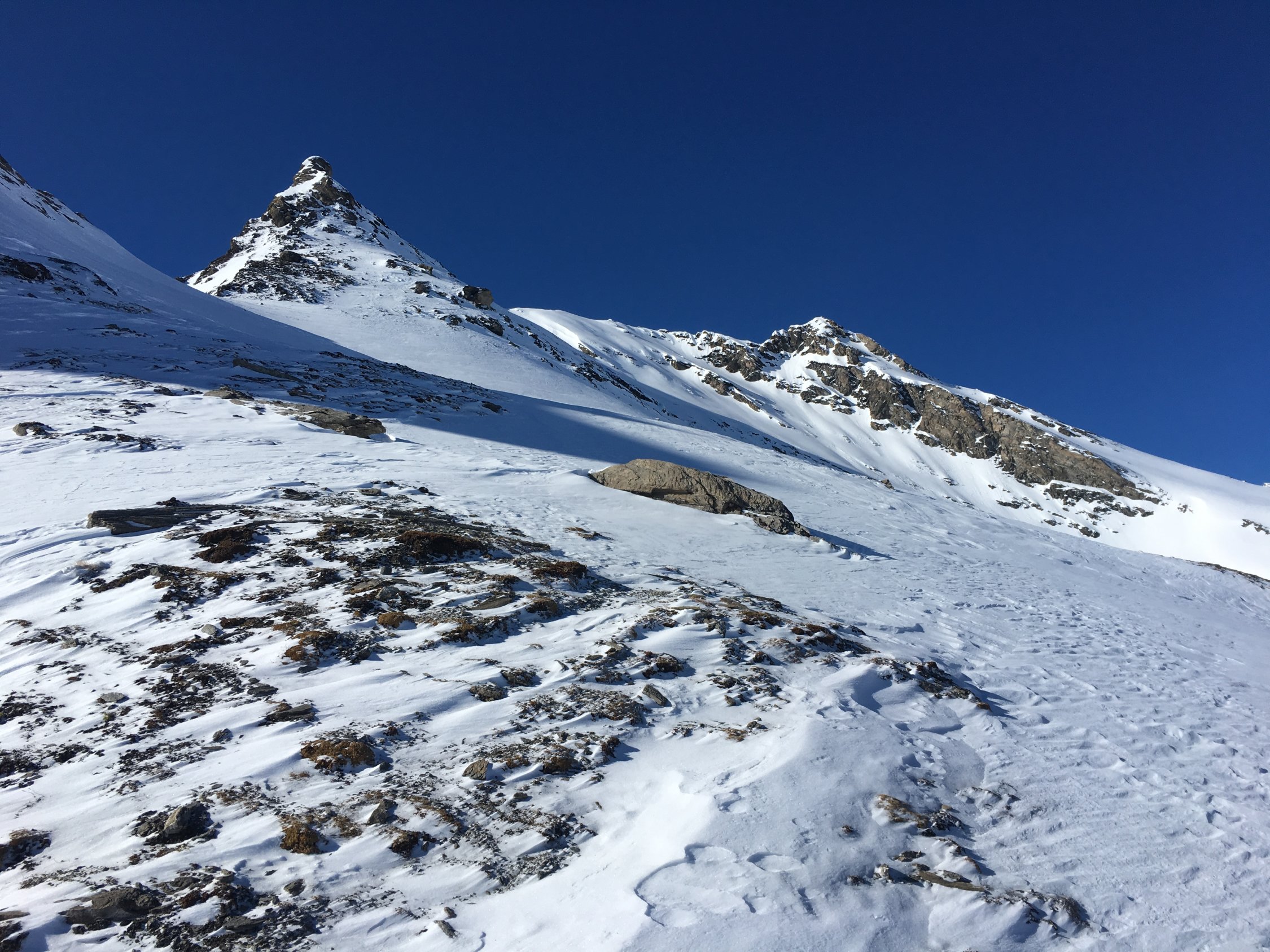 Gestartet in Leis auf 1526 m.ü.M. bis auf ca. 1800 m.ü.M. keine durchgehende Schneedecke. In der Flanke von der Satteltilücke konnten wir bis ca. 150 m unter dem Grat mit den Skis und Harscheisen aufsteigen, die Westseite hat sehr wenig und sehr lockeren Schnee. Der Aufstieg vom Talkessel bis unter den Breitengrat herrschten ideale Tourenverhältnisse. Unterhalb vom Grataufschwung den wir rechts in der Flank umgingen haben wir die Steigeisen montiert und sind bis hoch zum Gipfel gestapft.