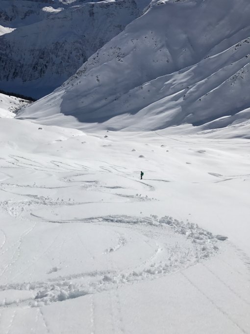 Sonst alles recht zerfahren, aber doch erstaunlich gut fahrbar. Wir haben uns beim abbe fahren bei 2350m etwas weiter westlich gehalten und noch ein paar schöne Schwünge im unverspurten Sulz machen können.