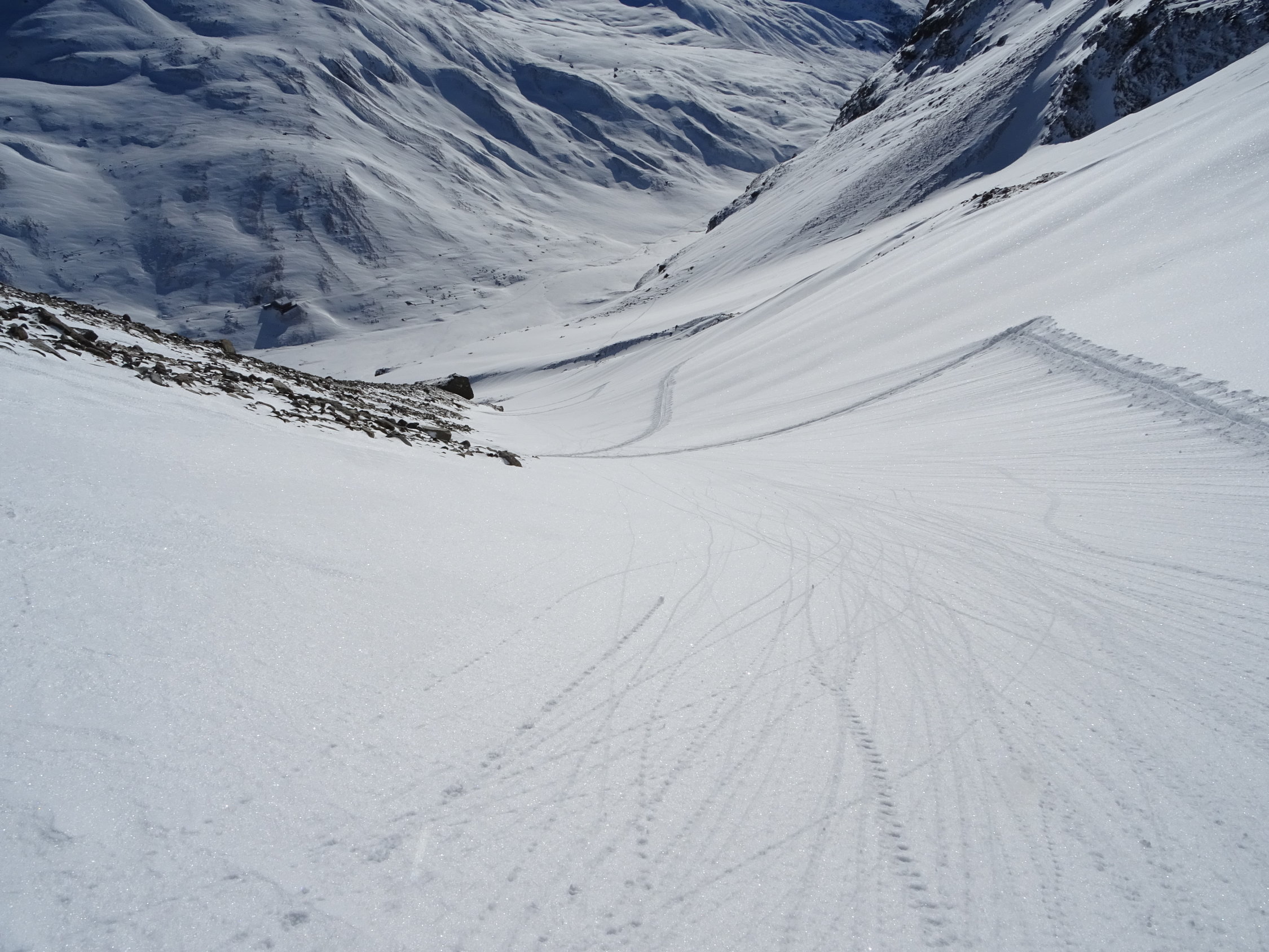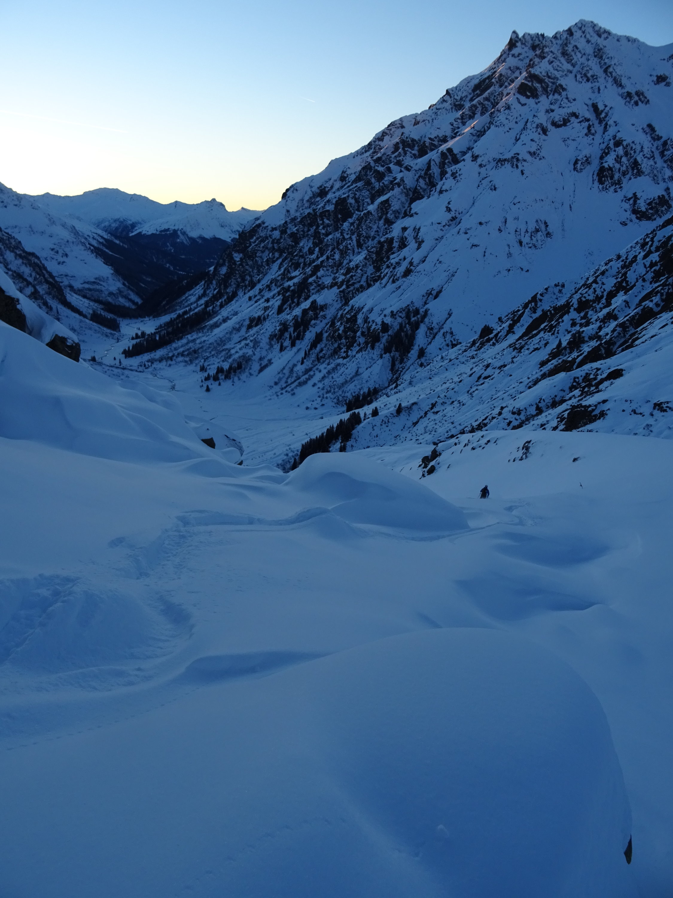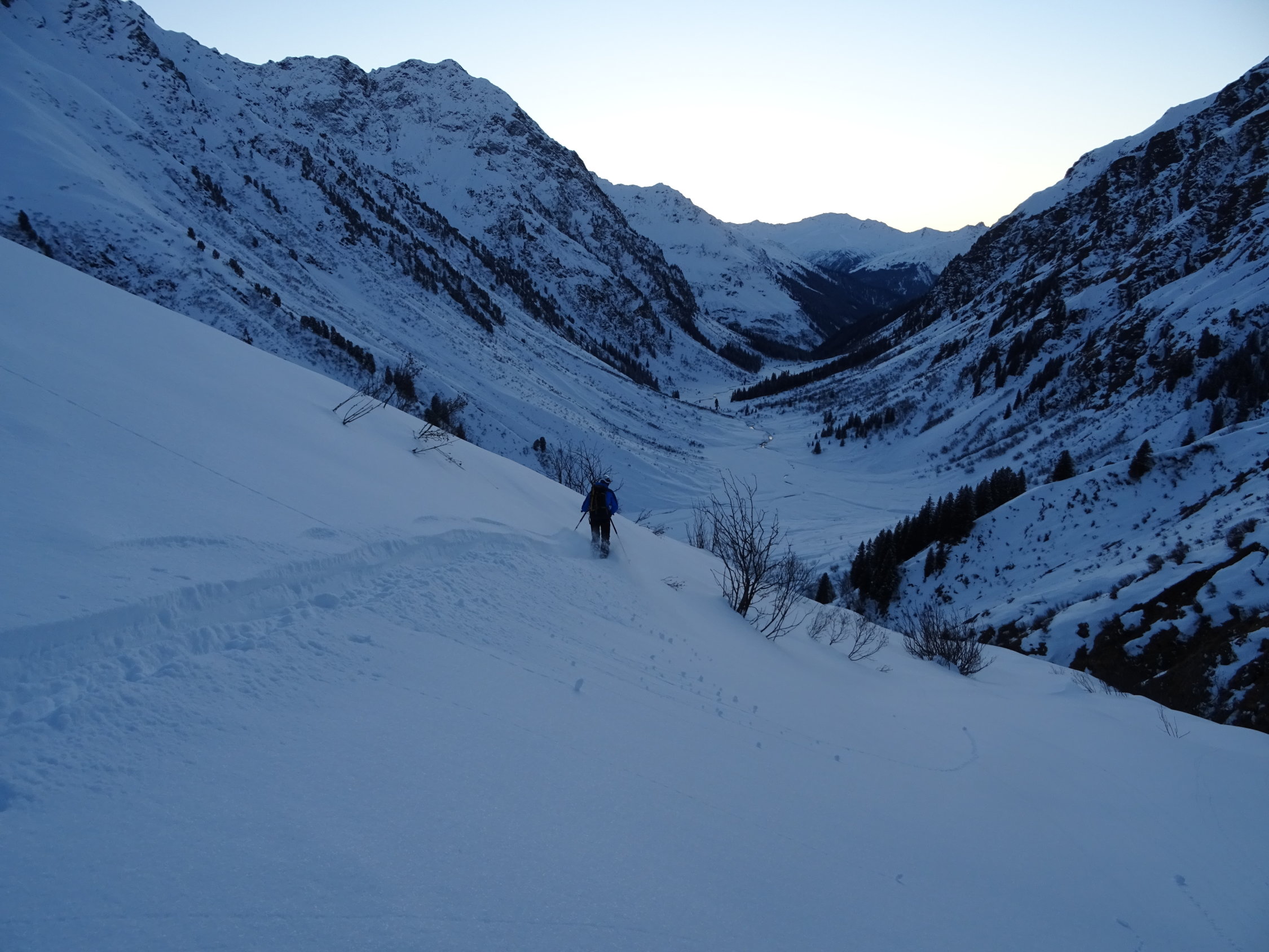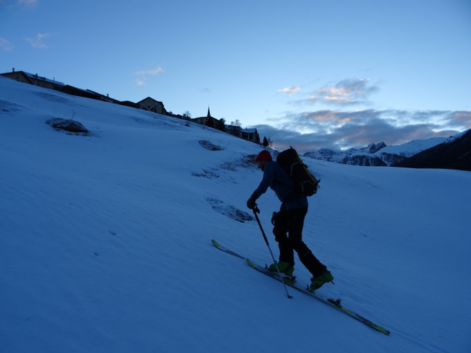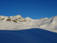 Die Skis konnten etwas oberhalb des Bahnhofs angeschnallt werden. Der Zustieg zur Tuoi-Hütte ist gut präpariert. Auf der Westseite der Tuoi-Hütte nimmt die Schneemenge stark zu. Bis 30cm bester Pulver der sich auf der Tour durchgehend hält bis Alp Sardasca und Alp Garfiun. Die Tour verlief ohne nennenswerten Steinkontakt.