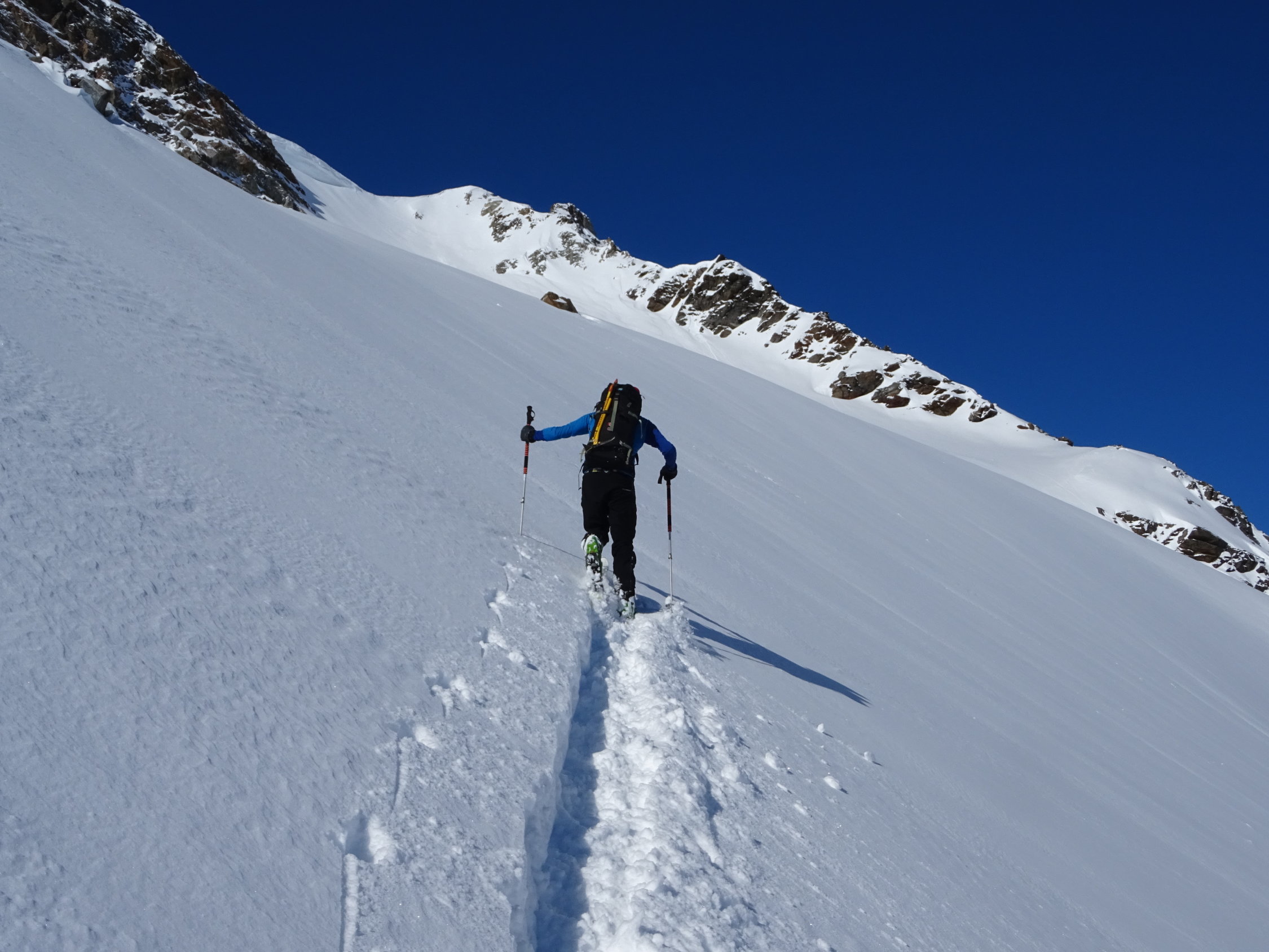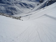 Umkehrpunkt unter dem Grat bei der Wächte, Triebschneetasche zur linken und über uns sind die letzten 5m bis zum Grat übler Griesschnee.