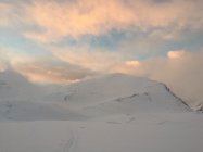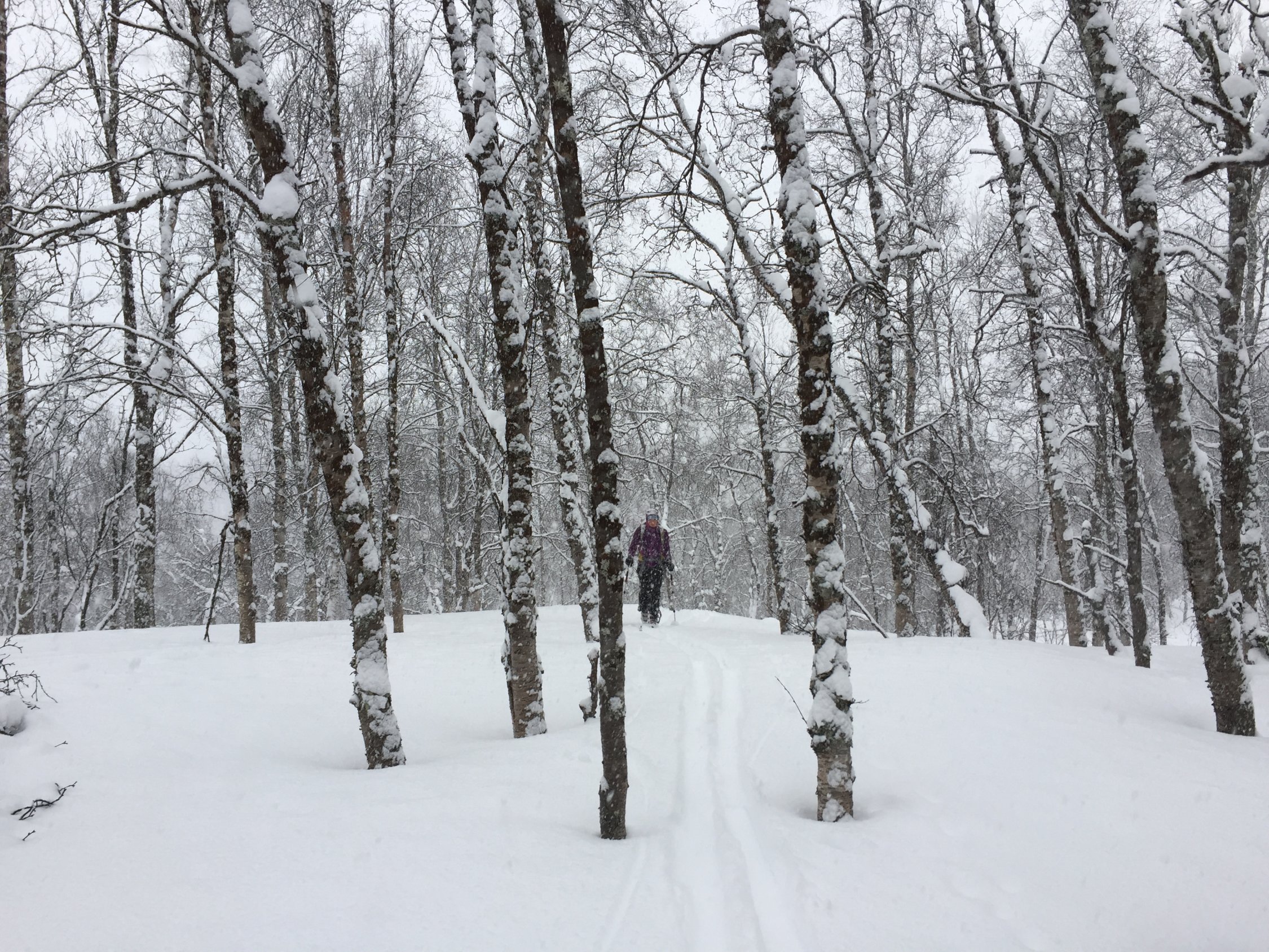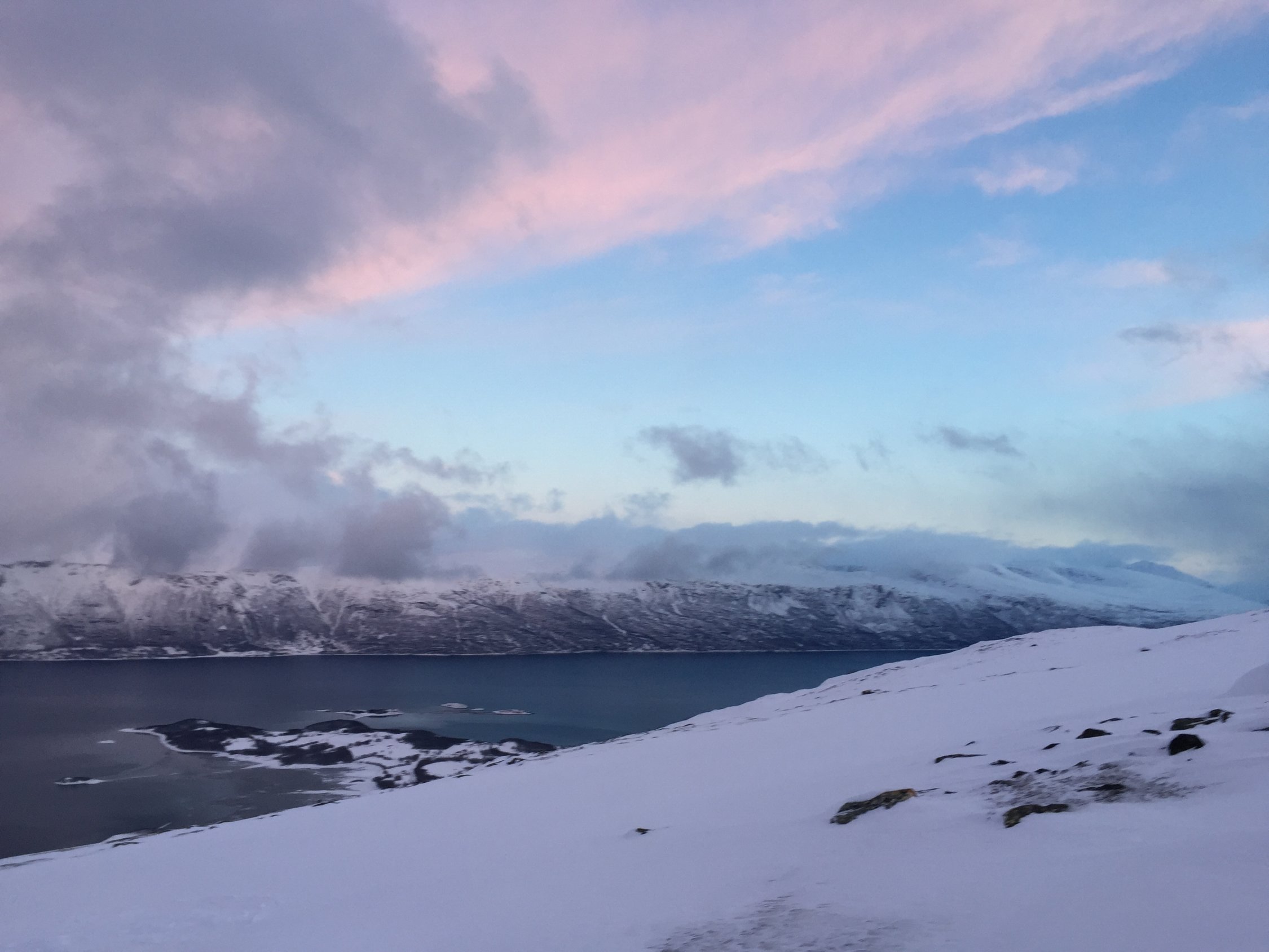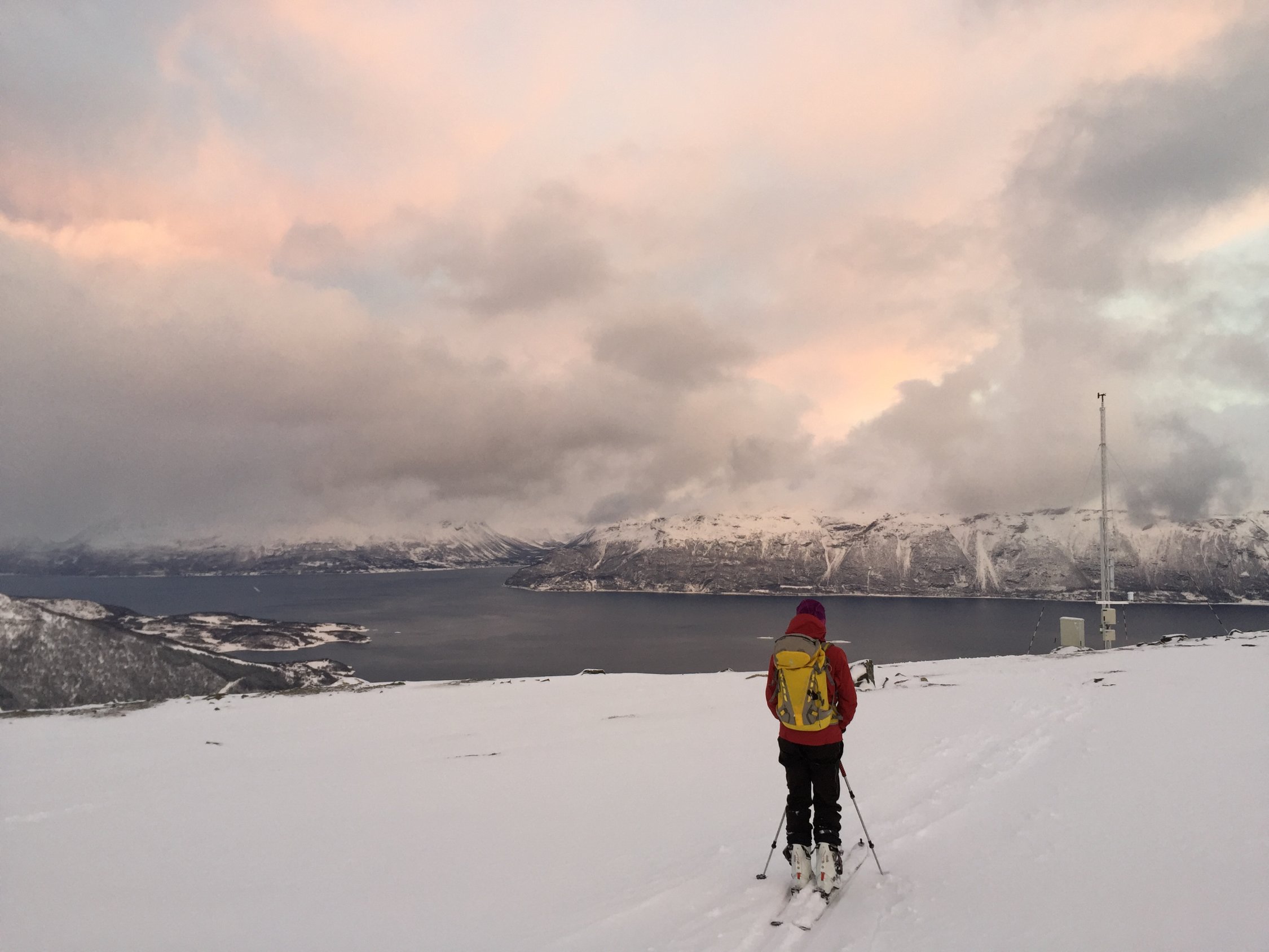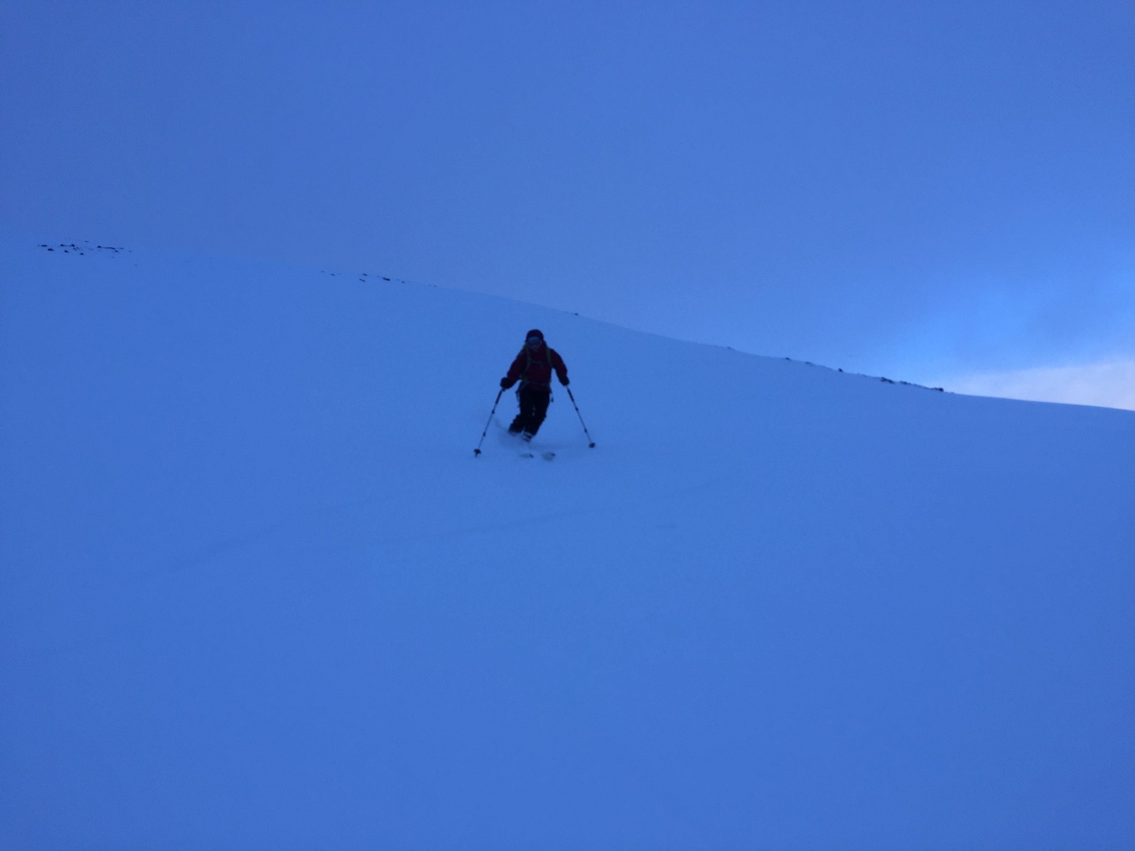 Ein weiterers Polartief hat in den Lyngenalpen wieder einiges an Schnee abgeladen. Für die Abfahrt erfreulich lag der Schnee heute vom Wind noch weitgehend ungestört auf einer harten Harsch- und Eiskruste.