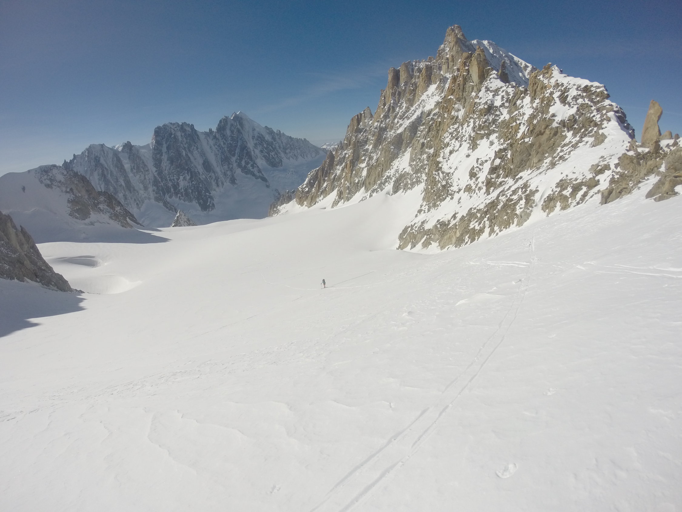 Die Abfahrt von Les Grands Monets ist schon sehr viel befahren und bietet keine Probleme. Das Bassin d'Argentière ist weniger eingeschneit als in anderen Jahren, bietet aber ebenfalls keine Probleme. Der untere Teil auf Refuge d'artentiere Höhe wart hart bis eisig, oben dann schön Pulvrig und zum Teil etwas windgepresst. Die Abfahrt ist ebenfalls eine Mischung zwischen Pulver und Windgepresst sowie im untersten Teil, schon auf der Piste ins Tal sehr hart/eisig.