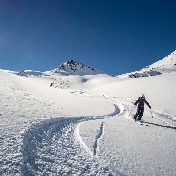 Auch die Verhältnisse im Grialetschgebiet sehen sehr gut aus. Die Skitouren ab Tschuggen waren am 15.02.2017 im unteren Bereich stark von Wind geprägt.