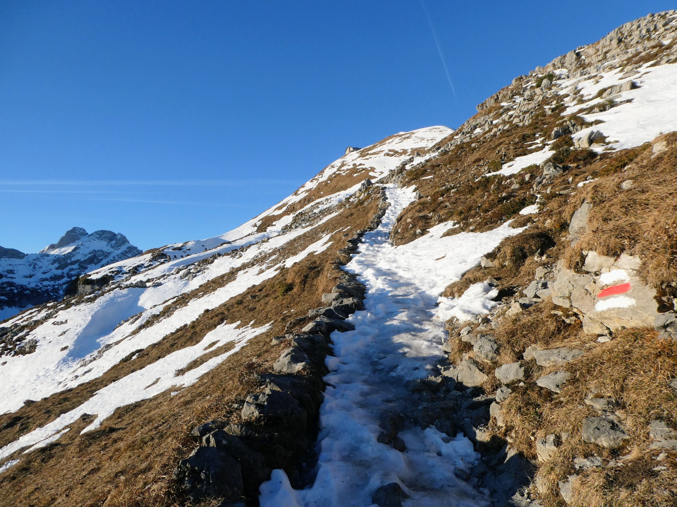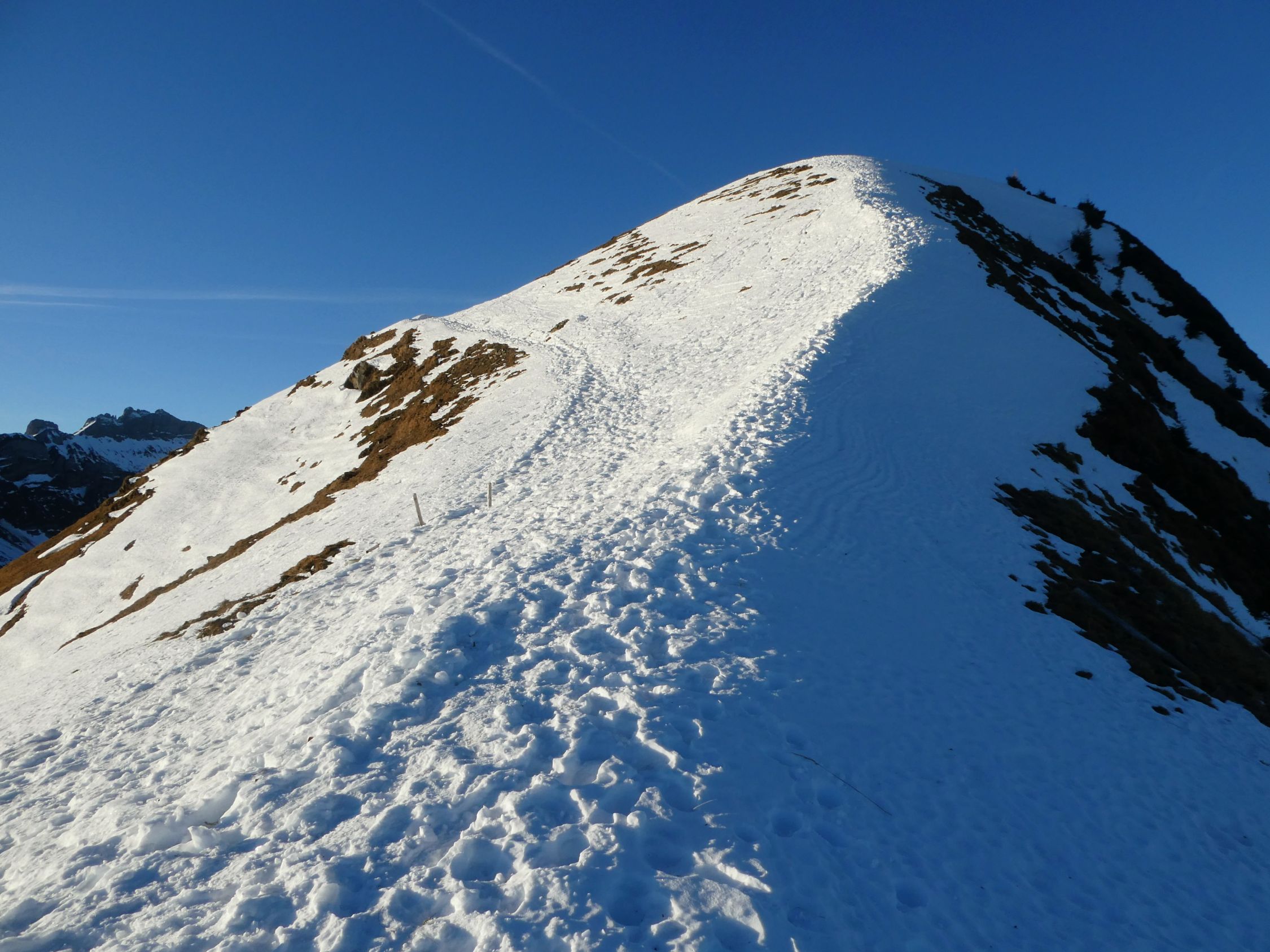 Schäfler-Neujahrstour mit Start in Schwende um ca. 7.20. Es herrschte erneut wolkenloser Himmel bei -10°. Im Tagesverlauf gab es einige Schleierwolken. Im Gipfelbereich war es kaum windig und deshalb milder als angenommen.