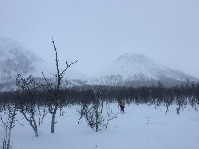 Auf der Ullfjord-Seite der Lyngenalpen hat die Warmfront von vor gut zwei Wochen dem Schnee erheblich mehr zugesetzt als am Lyngenfjord. Aufgrund fehlender Unterlage und des weggewehten Neuschnees der letzten Tage konnte die Tour auf den Russelvfjellet nicht durchführt werden. Als sicheres Ausweichziel bei der im Gebiet zur Zeit vorherrschenden Lawinenwarnstufe 3 liegt der Rundfjellet am Weg. Vom Strand von Sør-Lenangen ab ins Bjørndalen liegt genügend Schnee, im oberen Bereich zum Gipfel hin aber bereits arg vom Wind gezeichnet.