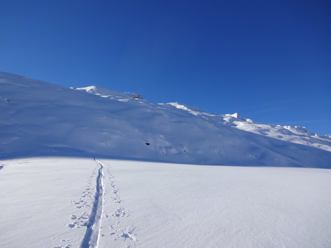 Trotz dem Neuschnee liegt noch immer knapp Schnee, so dass man nur mit Glück von Steinkontakten verschont bleibt. Besonders die Überschreitung ist zu beachten.