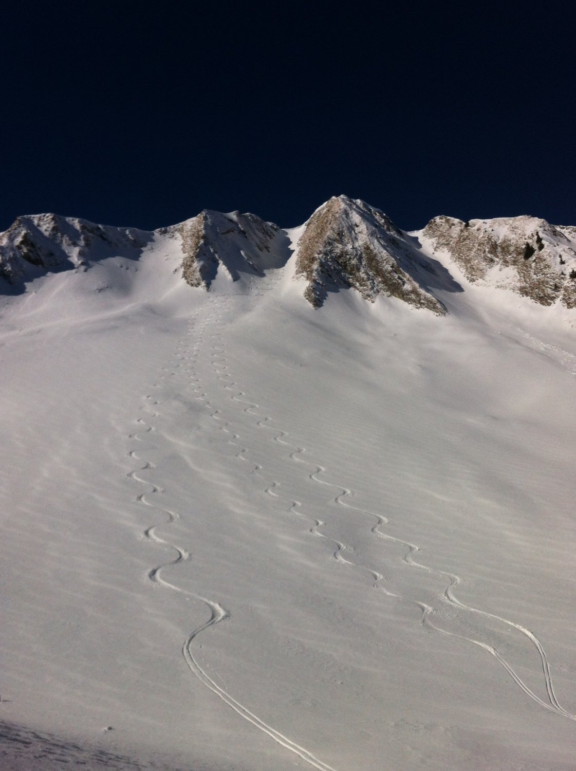 Ostcouloir perfekt, unverfahren mit ca. 5-10cm Neuschnee auf harter Unterlage. Auch in der Nordflanke herrschten sehr gute Verhältnisse;früher Start hat sich gelohnt. Heute Morgen war es glaub ab 1600m einfach überall gut, auch Abfahrt Richtung Morgetenalp sah super aus.