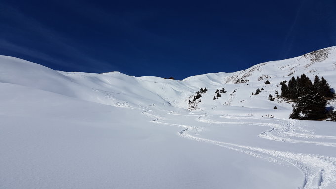 Morgen wohl bereits ein bisschen gedeckelt. Schnee wird in der Abfahrt nach Gschwantenmaad schnell zu knapp.