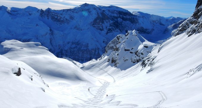 Zum Spuren besster Pulver, gegen Mittag an Südhängen schon feucht von der wärmenden Sonne. Heute ein früh und gut besuchter Gipfel.