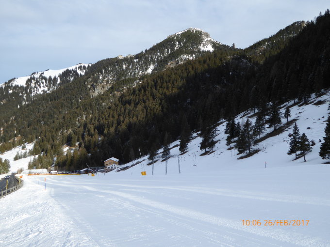 Temperatur am Start um den Gefrierpunkt. Durchweg hohe Bewölkung und milchige Sonne. Mild. Wanderweg bis Sass Stall gespurt und leicht vereist. Aufstiegsspur sehr hart und stellenweise leicht vereist (Harscheisen im Rucksack schaden nicht). Im oberen Teil der Route windverpressster Pulver mit leichtem Harschdeckel, der im Tagesverlauf auffirnt. Im oberen Teil schöner Pulverschnee, gegen Gurschg zu aufgeweichter Schnee. Abfahrt durch den Wald nach Gurschg steil aber gut verspurter Hang