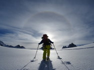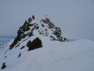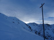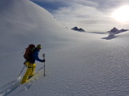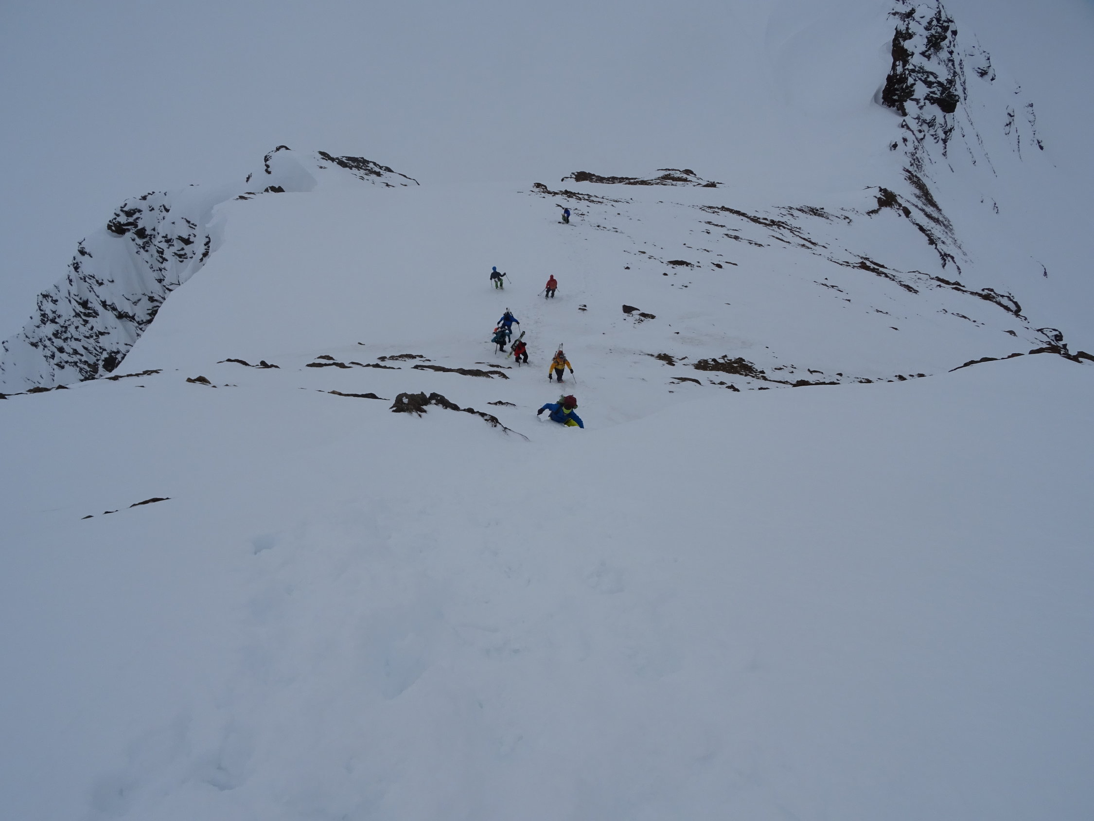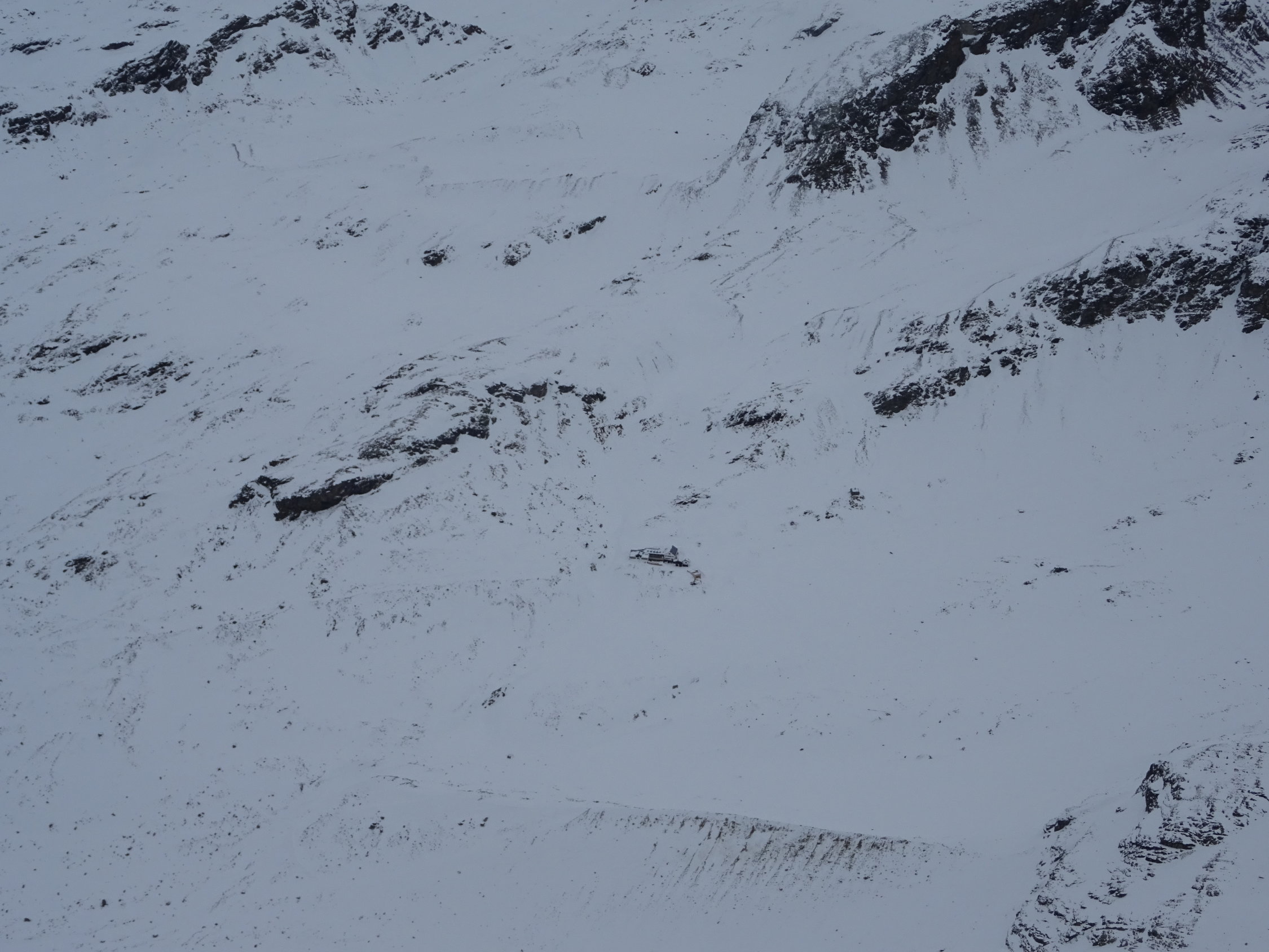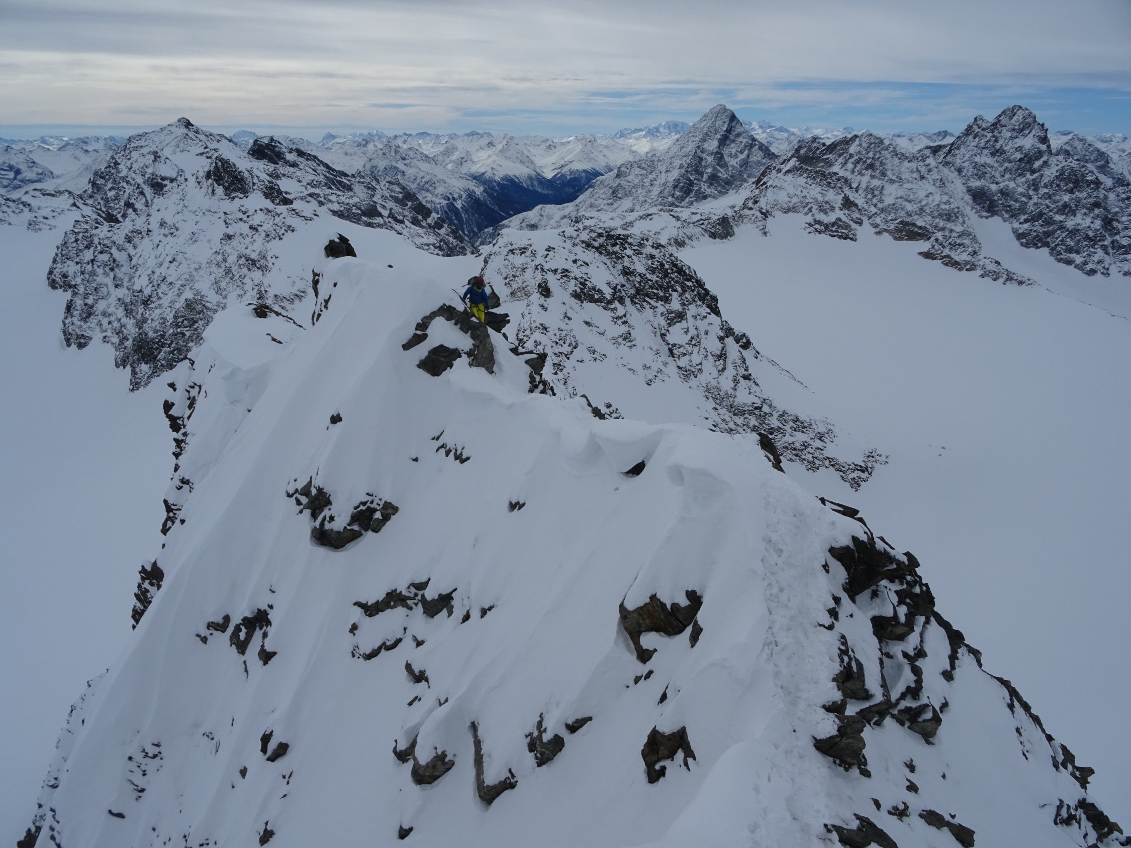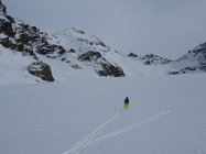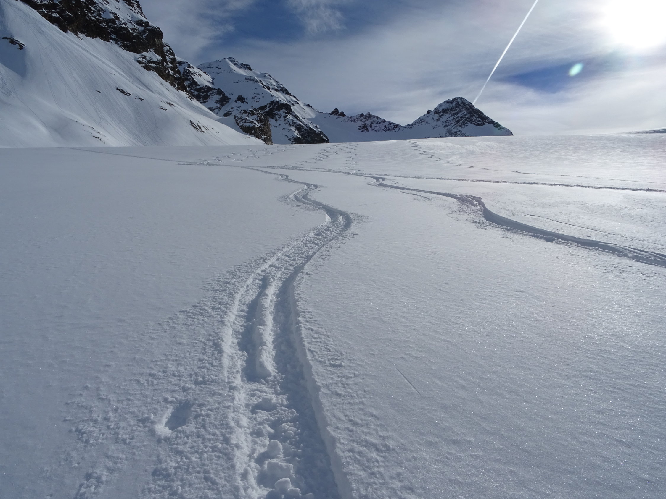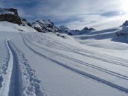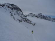 Masten 2 kurz die Harscheisen montiert. Von da an Pulver gut (bis 30cm) bis zum Skidepot auf 3082m. Zu Fuss hoch zum Gipfel. Überschreitung zur Schneeglocke auch gespurt.