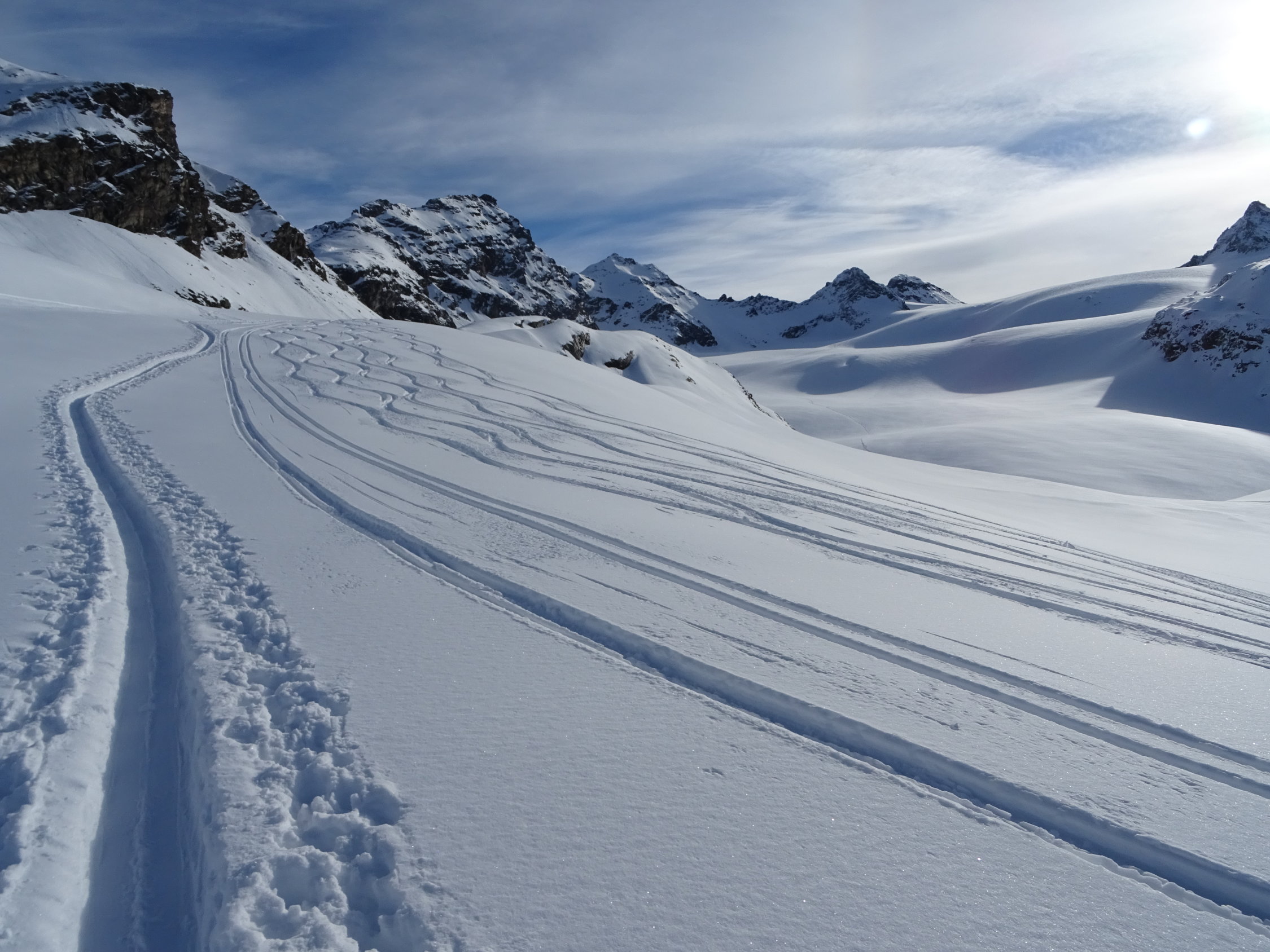 Ausgezeichnet auf der ganzen Tour. Monbiel bis Novai auf perfekter Langlaufloipe. Dann auf sehr guter Spur zur Alp Sardasca. Im Aufstieg zu