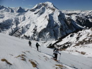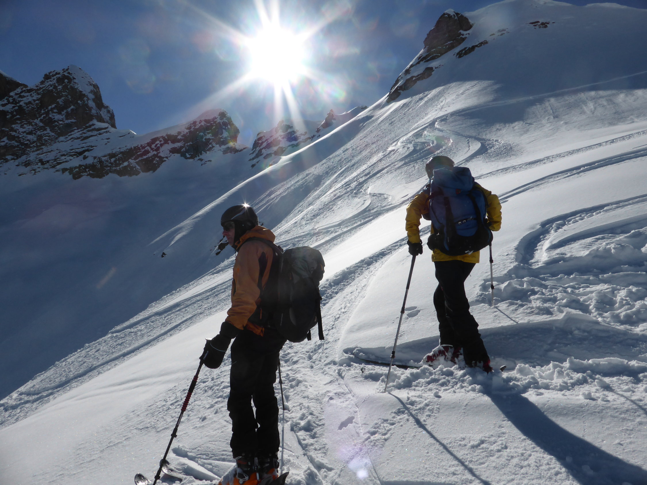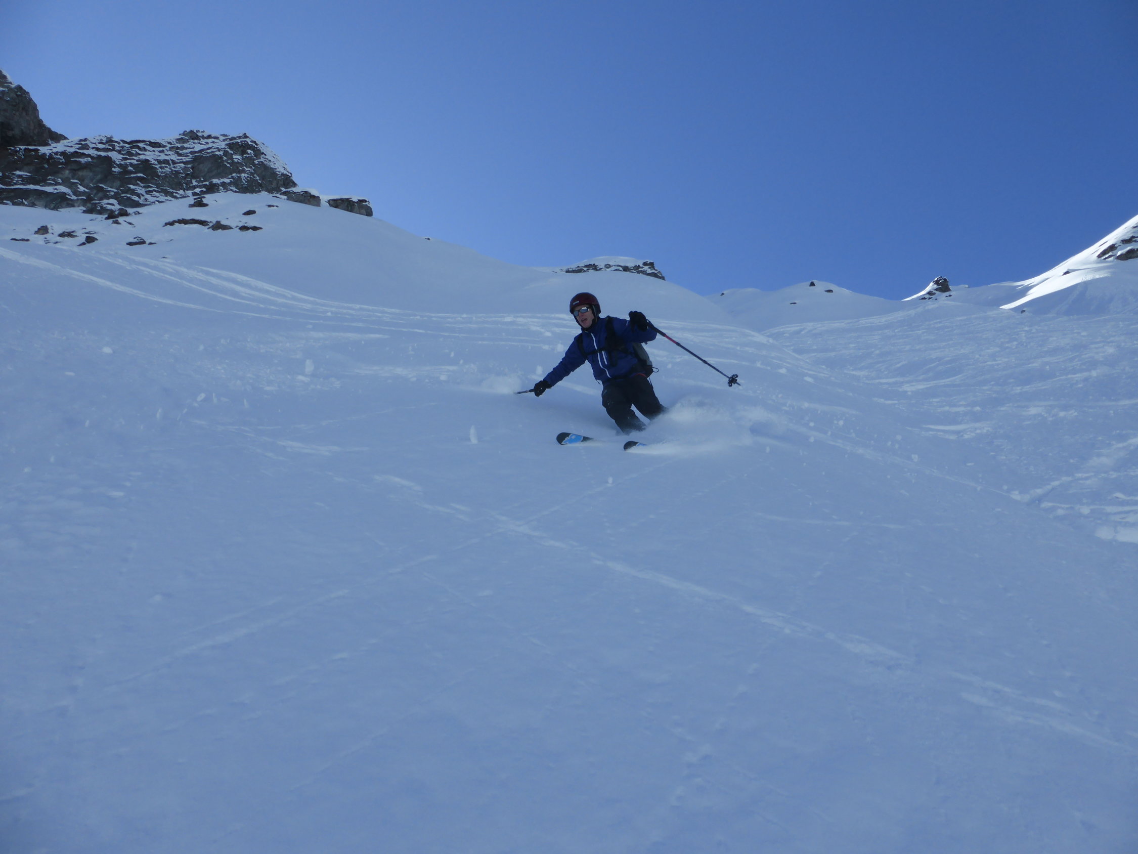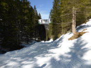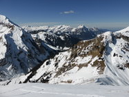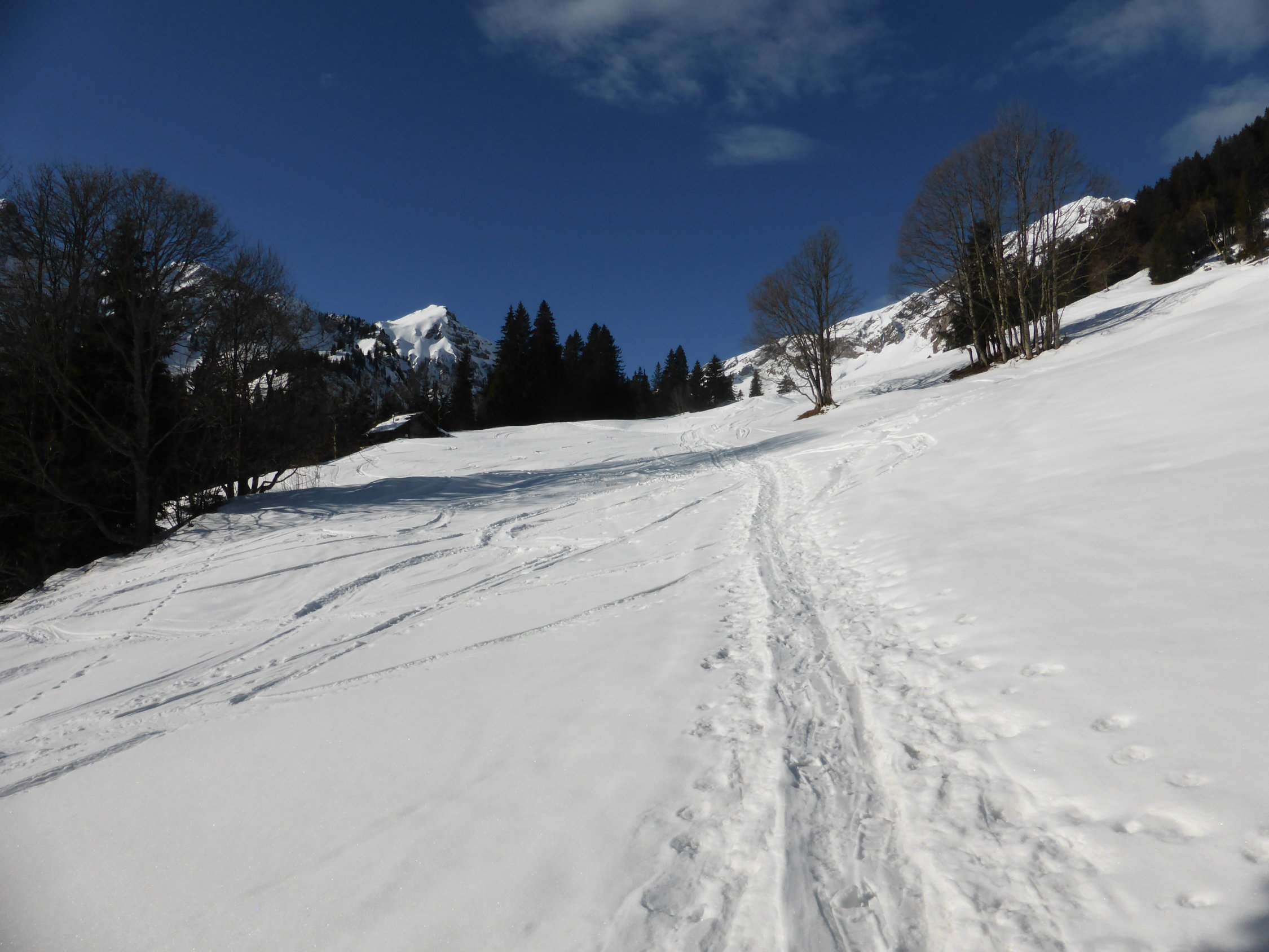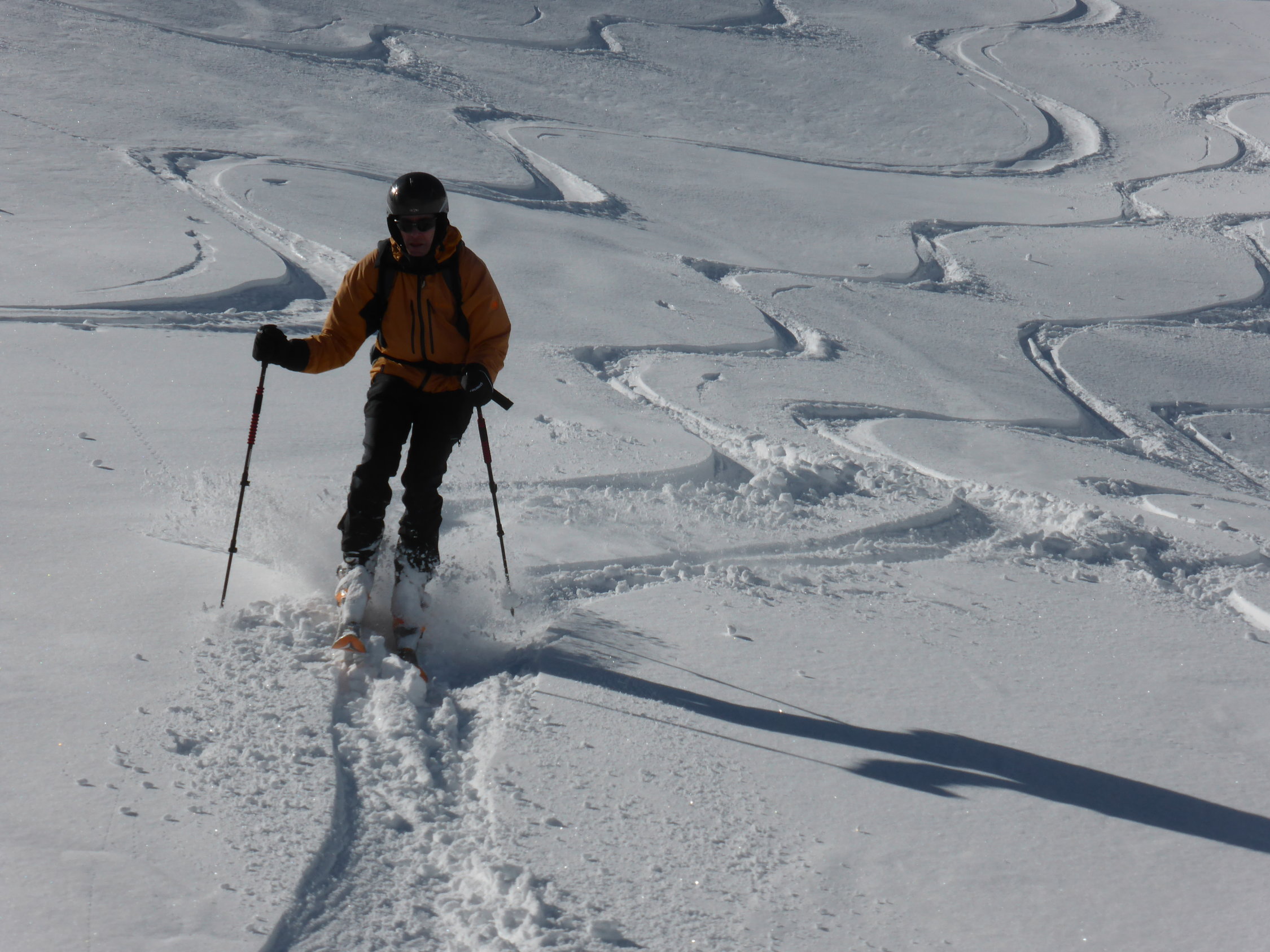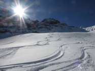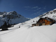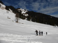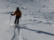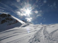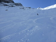 In der Abfahrt trotz vieler älterer Spuren sehr gut zu fahrende Ostflanke. Im schattigen Bereich Pulver, dann schwerer Pulver und etwas Sulz. Die Schlittelpiste hinab gut zu fahrender Sulz.