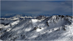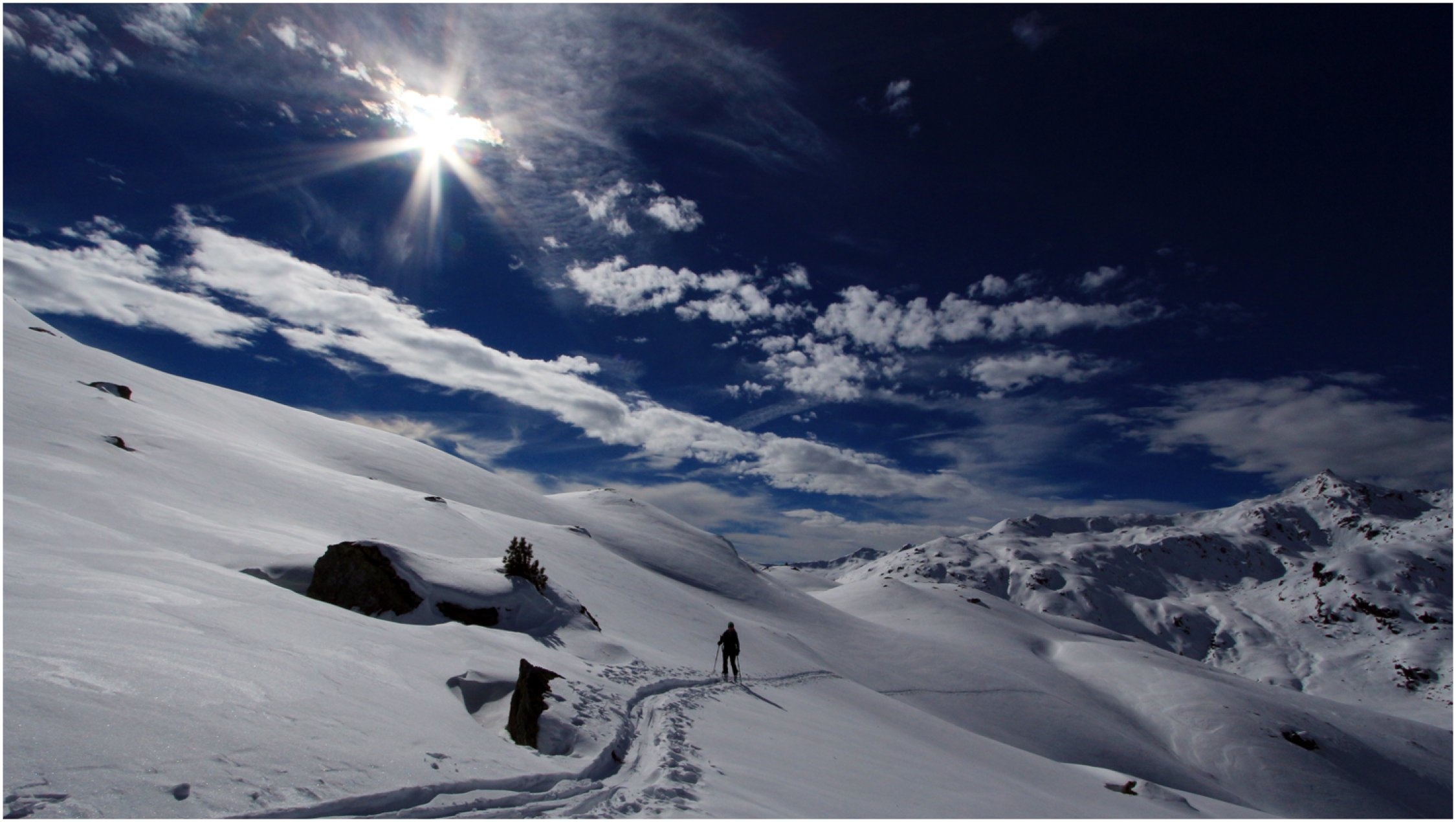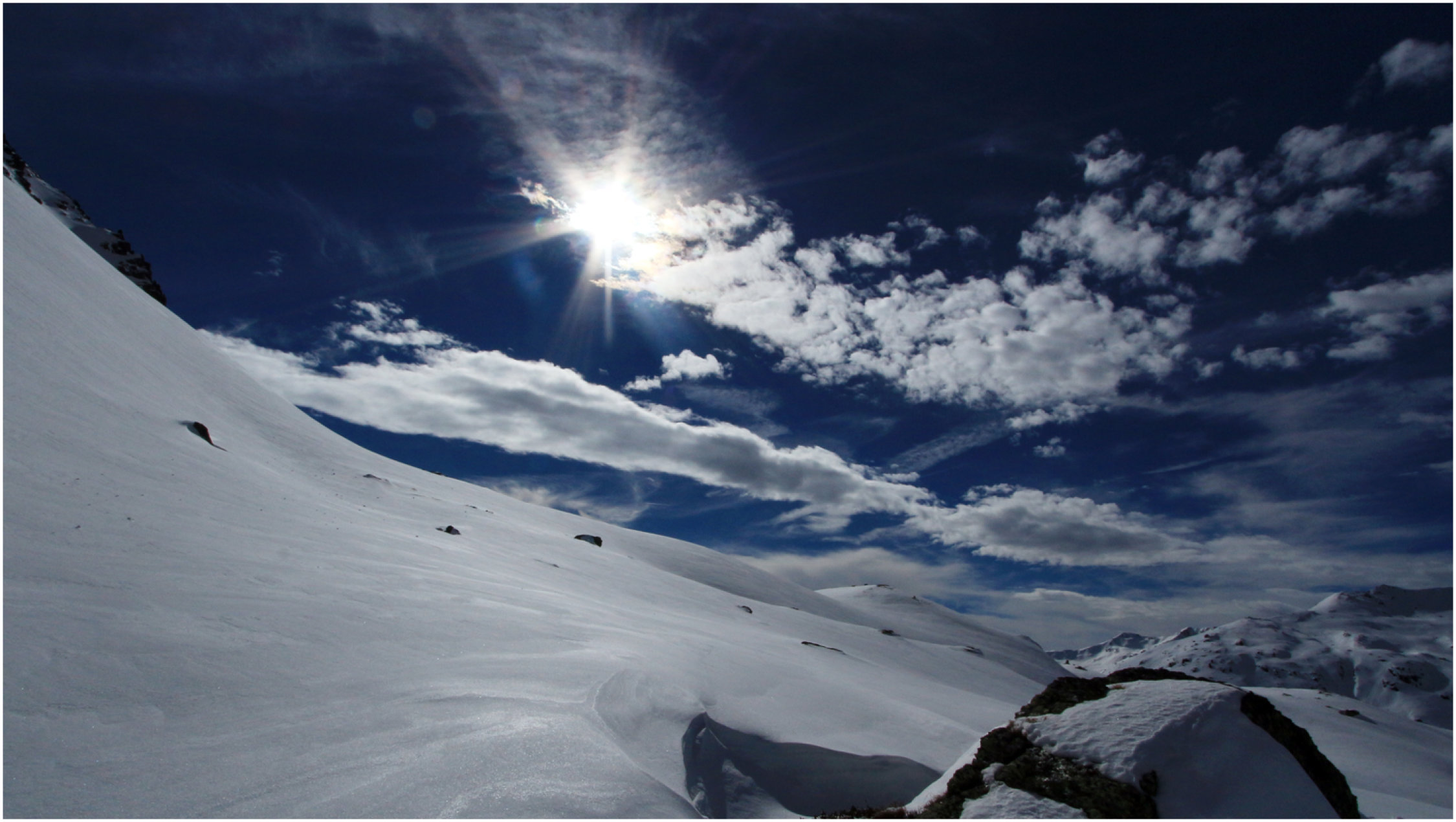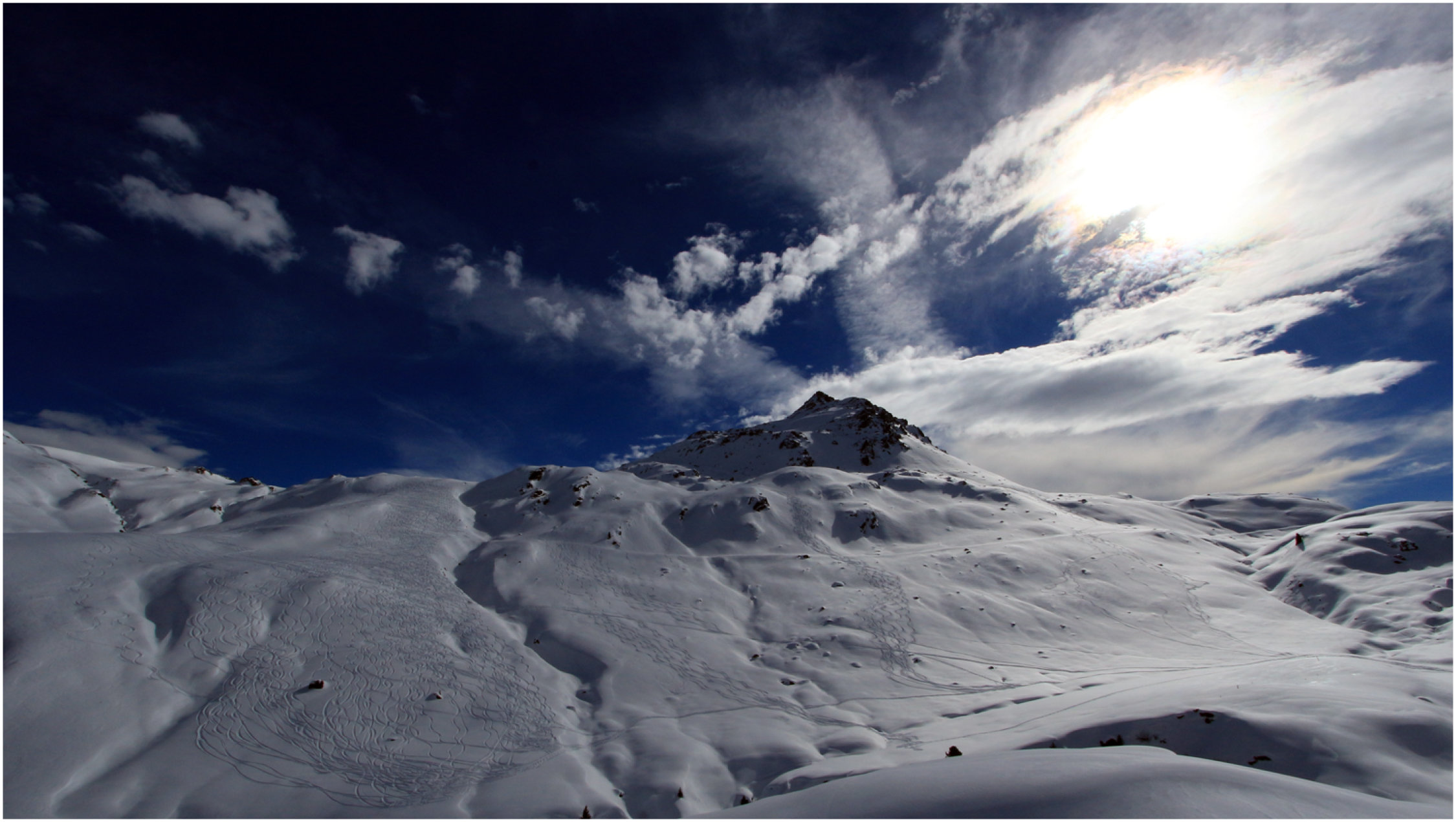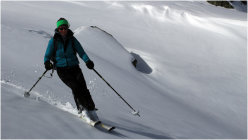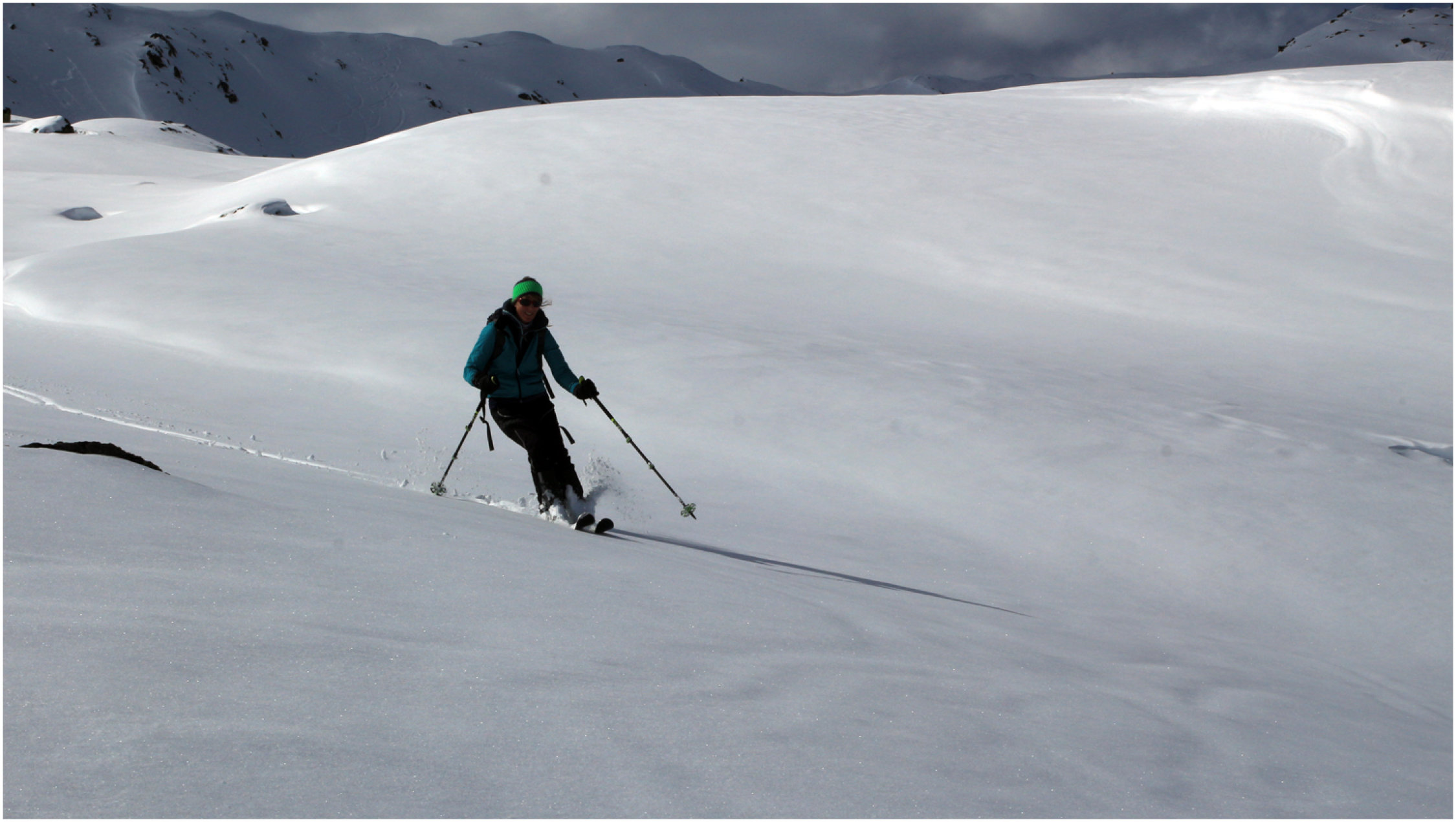 Abfahrt in den schattseitigen Hängen durchaus noch schwerer Pulver, aber insgesamt schon recht schwerer Schnee. Gewachste Ski von Vorteil.