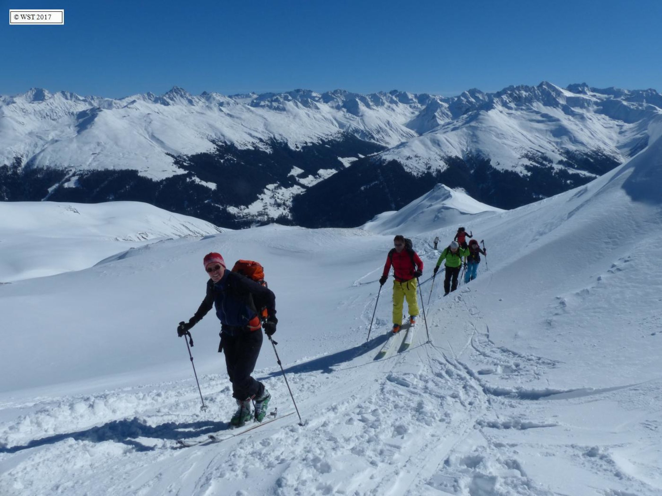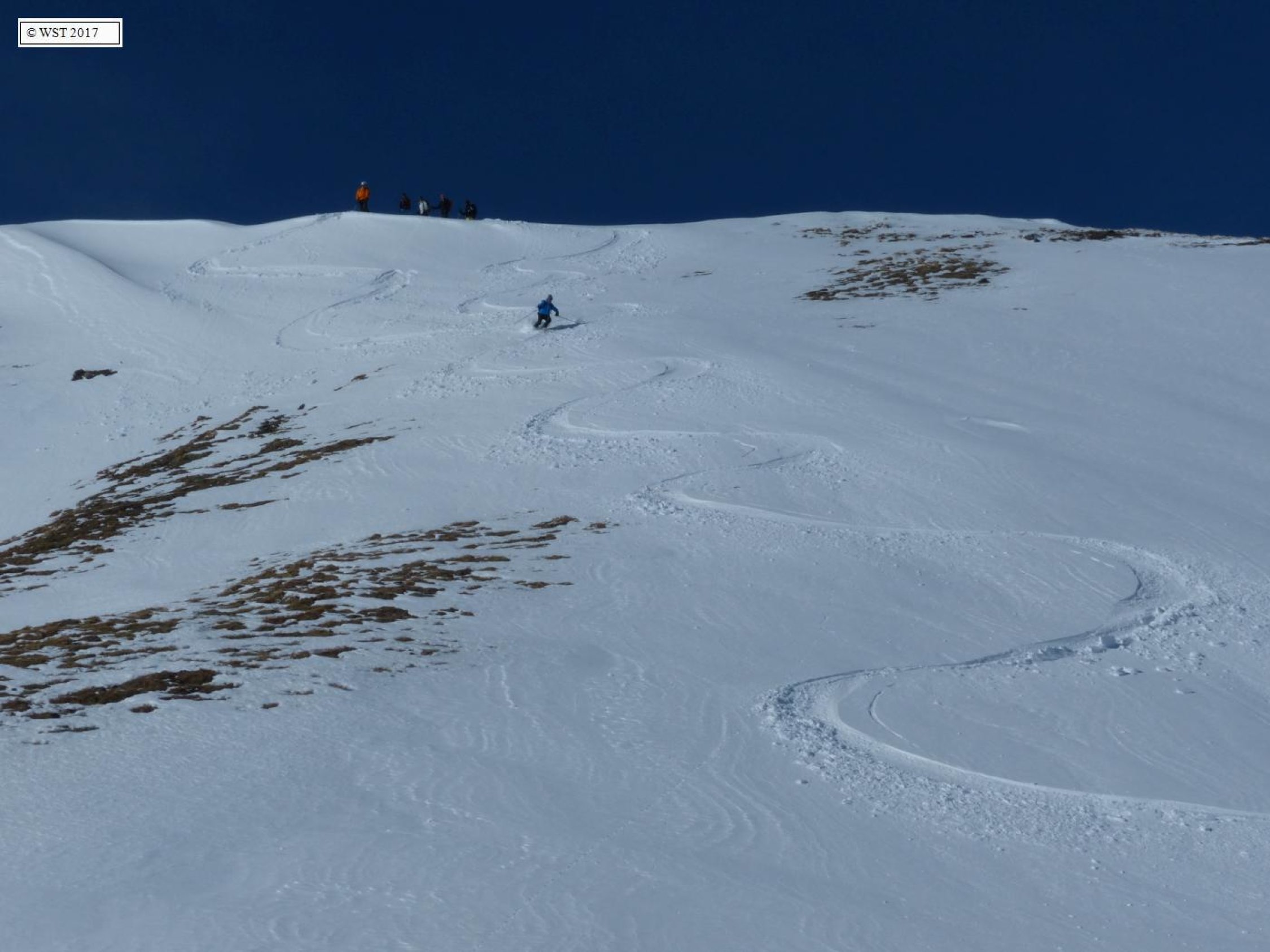 Abfahrt über Variante Erber Berg mit "Direkteinstieg" vom Gipfel; wir waren interessanterweise die Ersten die das seit dem letzten Schneefall (der sehr gering in der Vornacht war) fuhren.